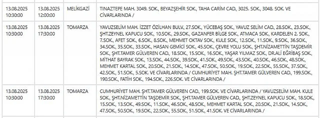 Kayseri'de elektrik kesintisi raporu: 13 Ağustos'ta etkilenecek bölge listesi!