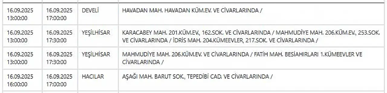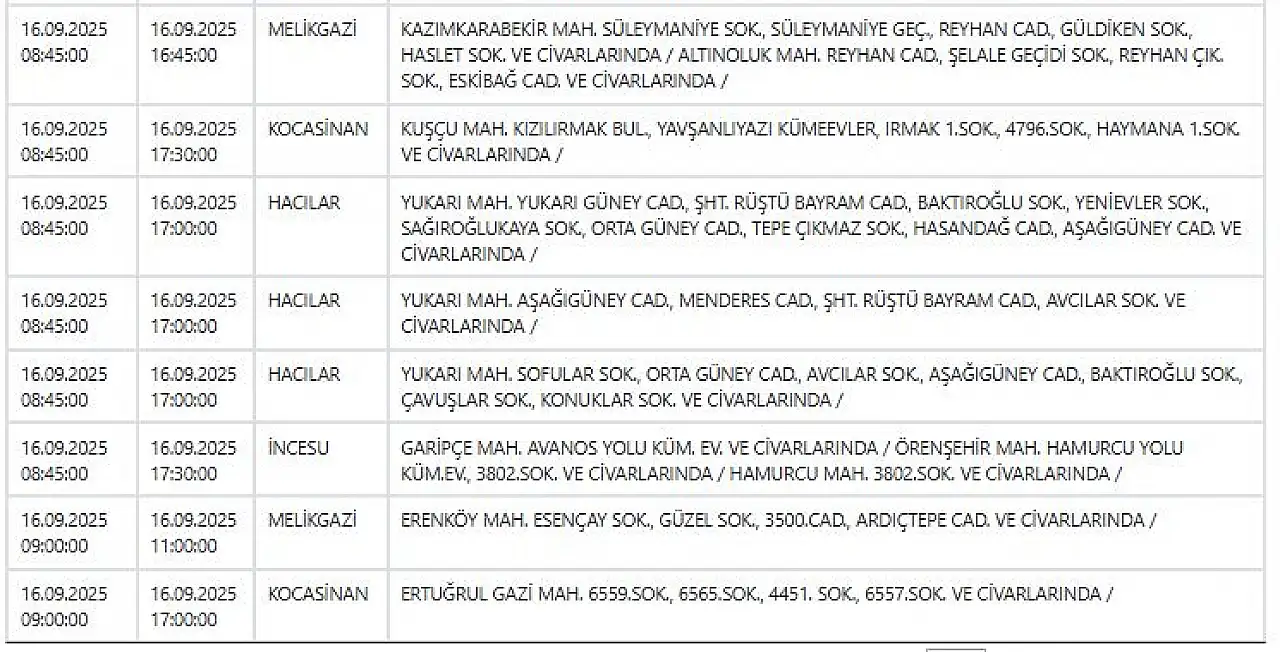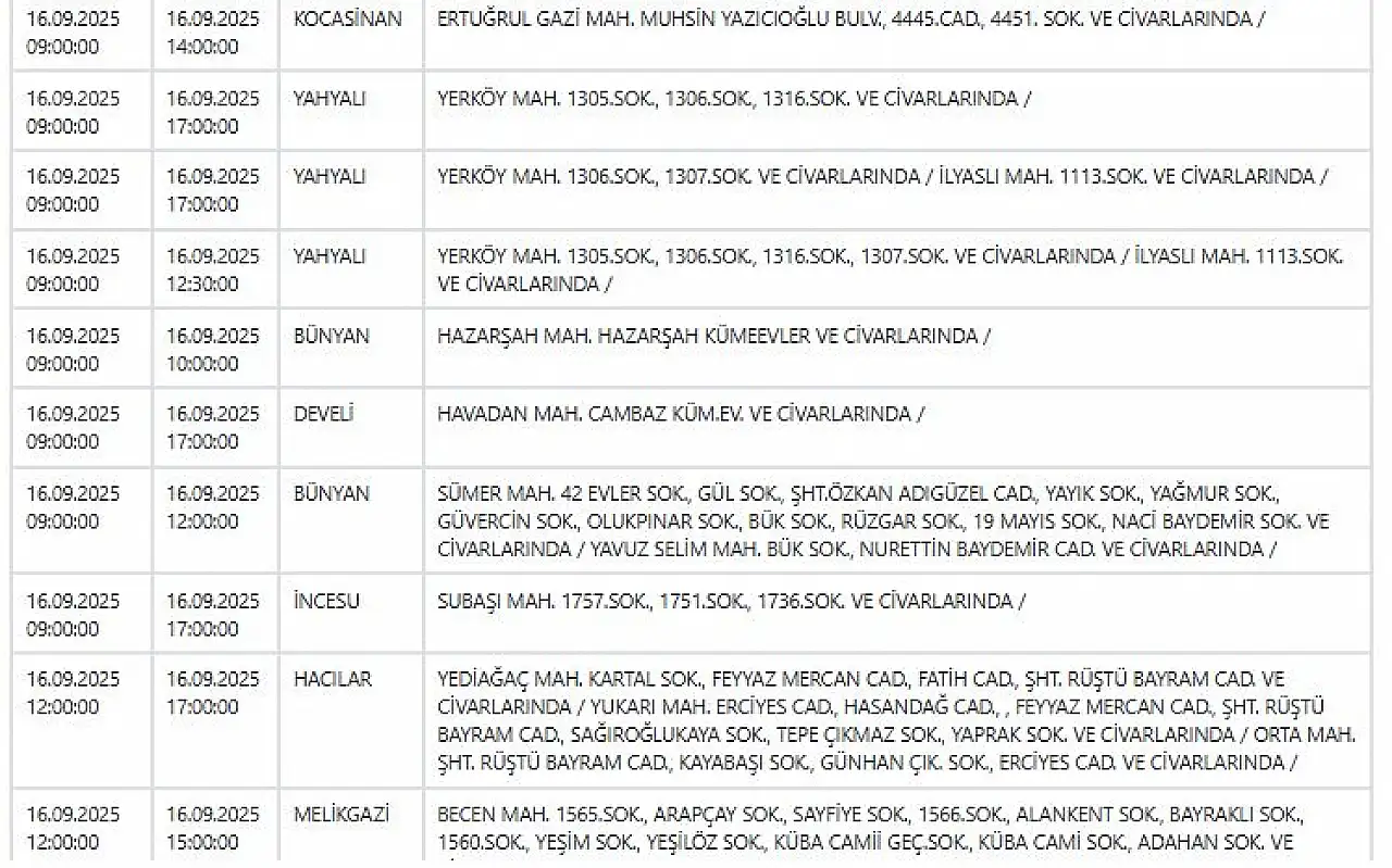 Kayseri'de elektrik kesintisi uyarısı: Hangi ilçeler etkilenecek? 16 Eylül 2025
