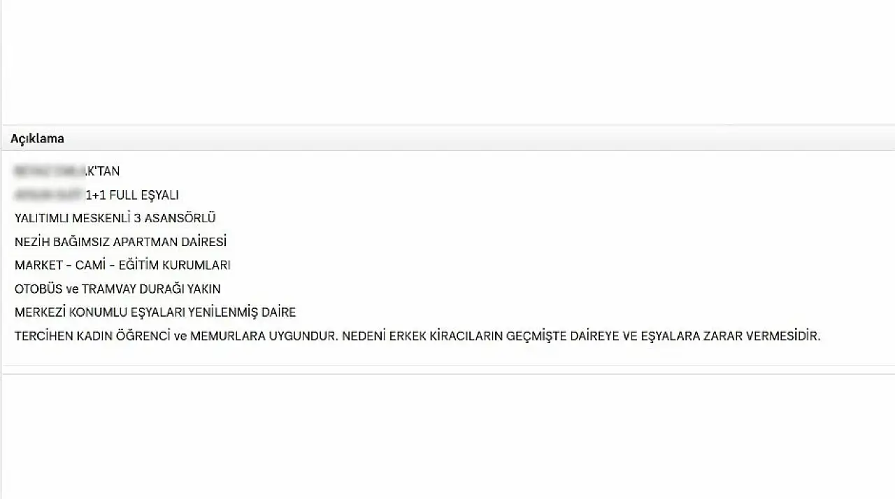 Ancak son dönemde Talas’ta dikkat çeken bir durum ortaya çıktı. Bir ev sahibinin kiralık daire ilanında erkek öğrencilere ev vermediği belirtiliyor. Ev sahibi, ilan açıklamasında tercihini gerekçelendirerek şunları yazdı; ‘Tercihen kadın öğrenci ve memurlara uygundur. Nedeni erkek kiracıların geçmişte daireye ve eşyalara zarar vermesidir.’