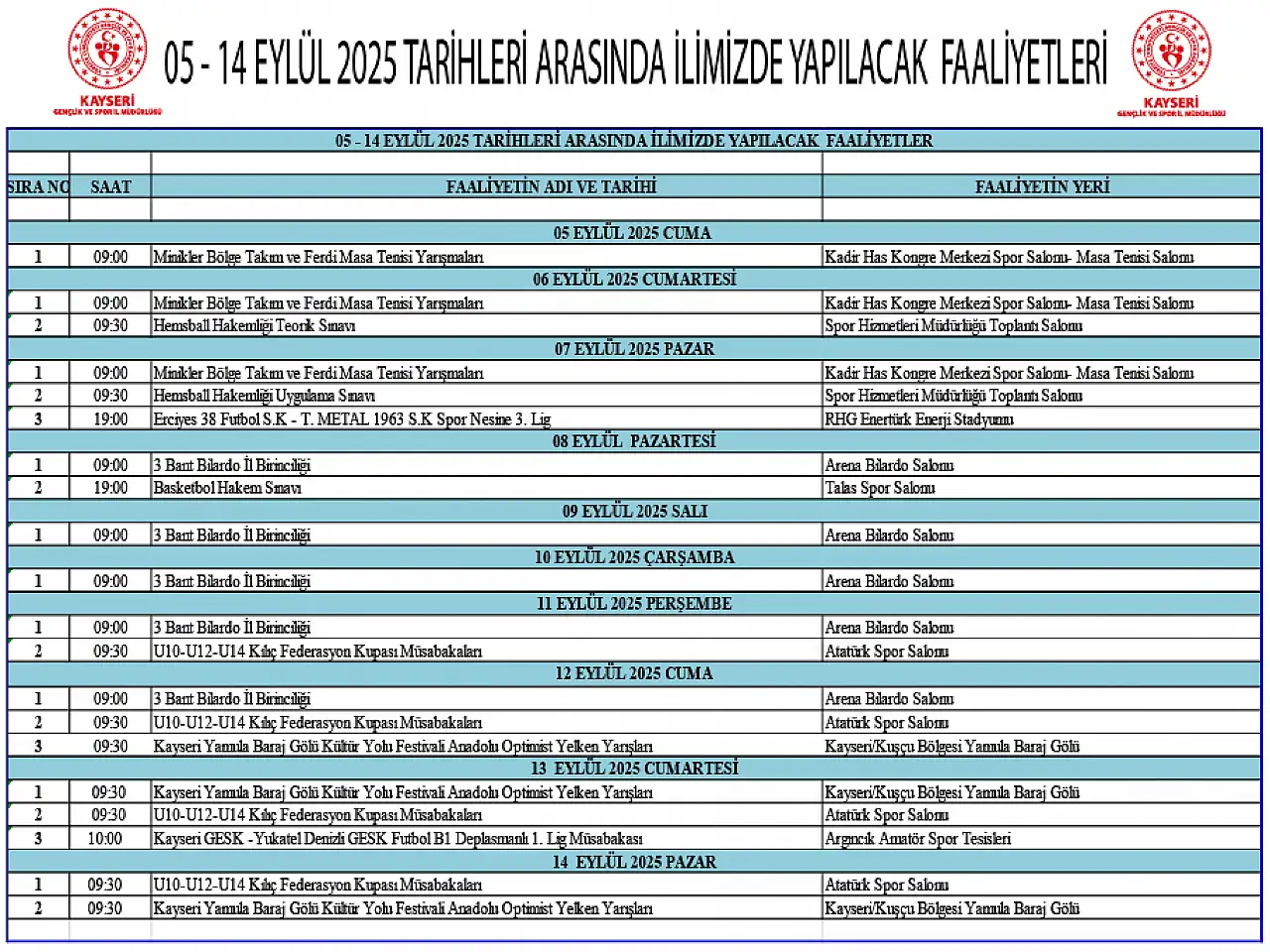 Kayseri Gençlik ve Spor İl Müdürlüğü tarafından yayımlanan takvime göre ilk müsabaka Minikler Bölge Takım ve Ferdi Masa Tenisi Yarışmaları yarın 5 Eylül 2025 Cuma günü Kadir Has Kongre Spor Salonu-Masa Tenisi Salonu'nda gerçekleştirilecek.