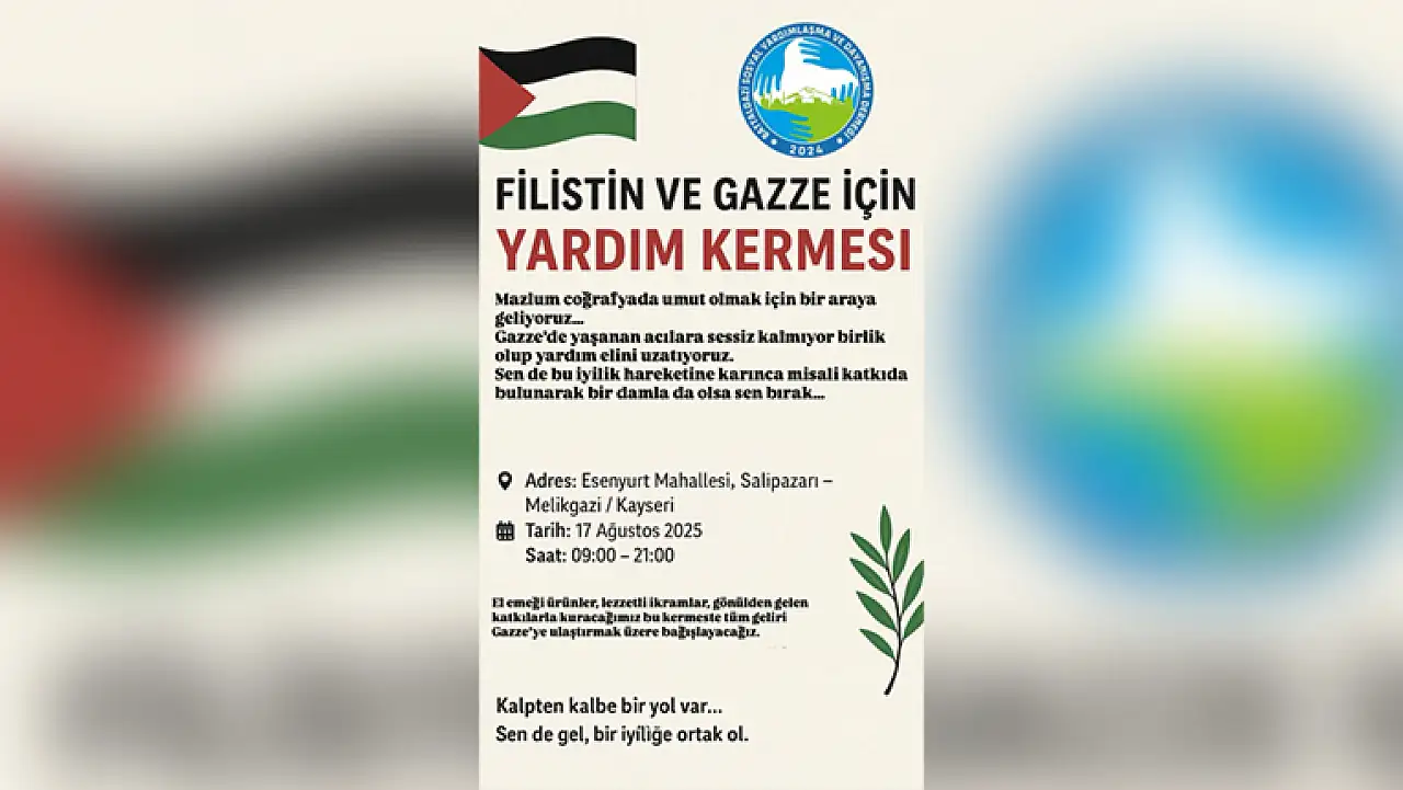 Kayseri'de Battalgazi Sosyal Yardımlaşma ve Dayanışma Derneğince Filistin'e yardım kermesi düzenlenecek. Detaylar haberimizde...