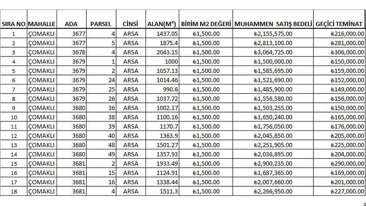Arsaların büyüklükleri 1000 ile 2043 metrekare arasında değişiyor. Metrekare birim fiyatı 1.500 TL olarak açıklanırken, muhammen bedeller 1,5 milyon TL’den 3 milyon 64 bin TL’ye kadar ulaşıyor. Katılımcıların yatırması gereken geçici teminatlar ise 149 bin TL ile 306 bin TL arasında değişiyor.