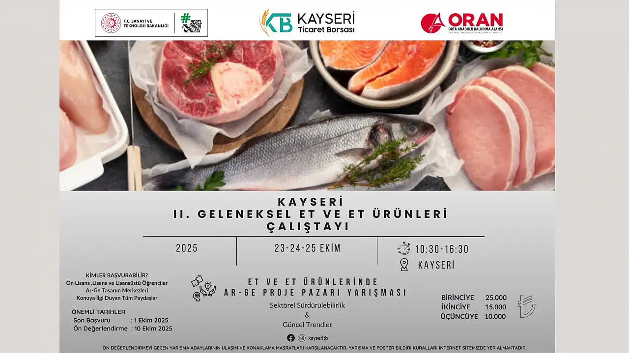 Kayseri II. Et ve Et Ürünleri Çalıştayı bu yıl 23-25 Ekim 2025 tarihlerinde düzenlenecek. Çalıştay Kayseri'de saat 10:30 16:30 arasında etkinlik için belirlenecek alanda gerçekleştirilecek.