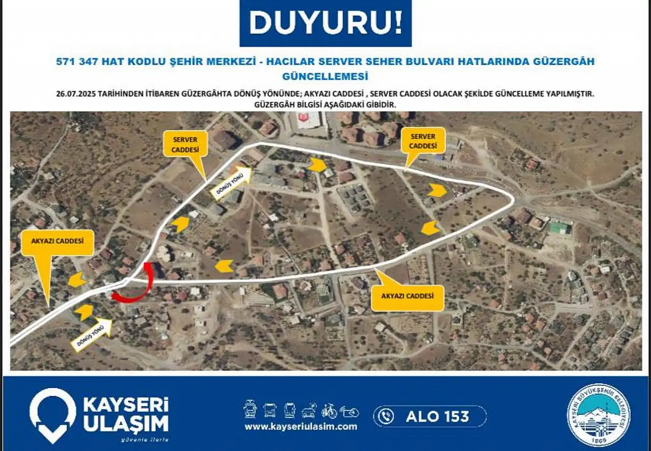 Kayseri’nin Hacılar ilçesinde yapılan güzergah değişikliği bölge halkına şu şekilde duyuruldu, ‘26.07.2025 Cumartesi itibariyle Hacılar’dan çarşı istikametine giden Akyazı mahallesi Server’e giren otobüsler, fotoğraftaki gibi önceki güzergâhlarının tersi yönünde hareket edecektir’
