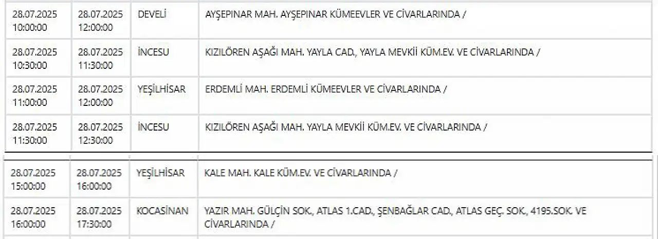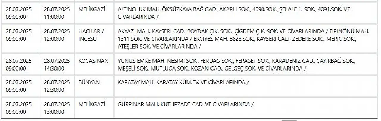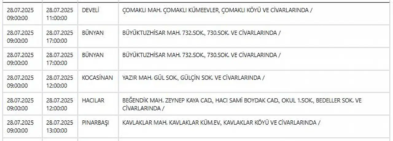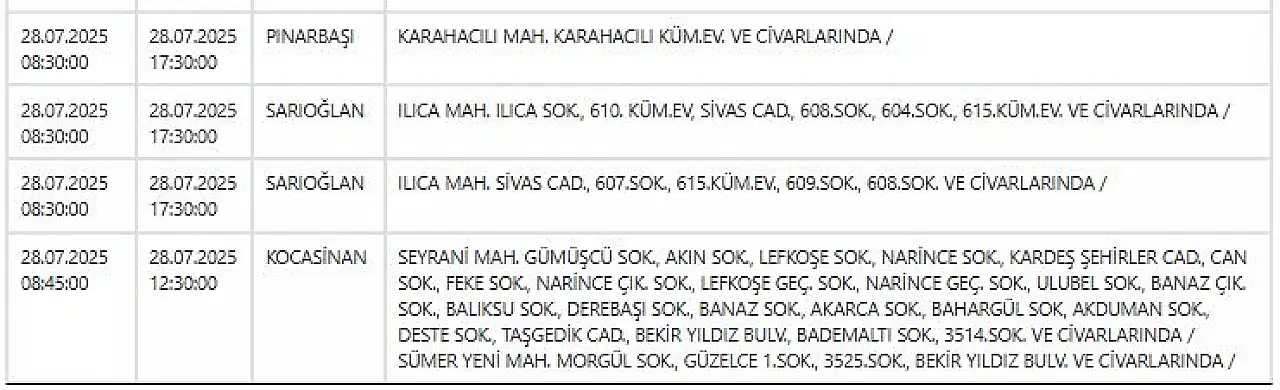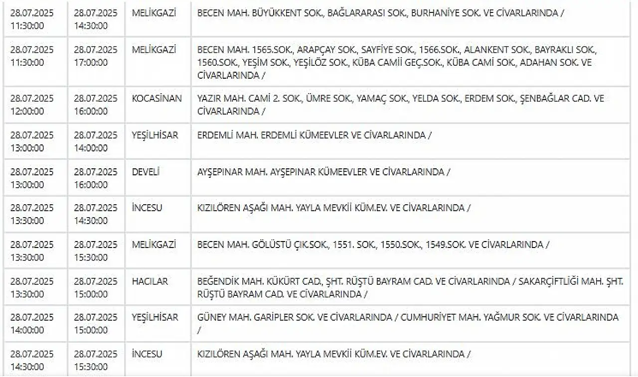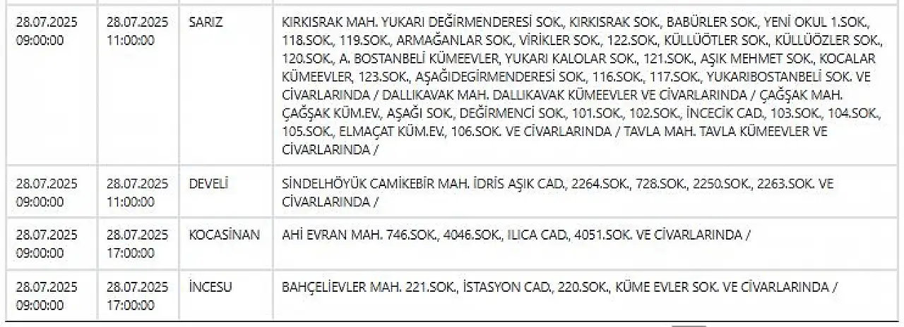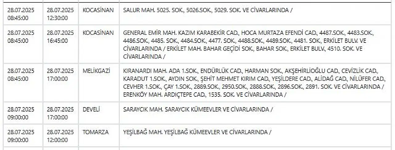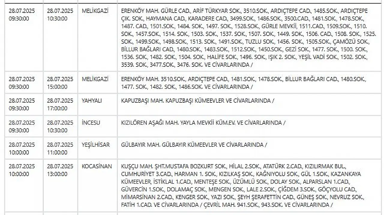 KCETAŞ’tan edinilen bilgilere göre yarın (28 Temmuz 2025) aşağıdaki mahallelerde elektrik kesintisi yaşanacak.
