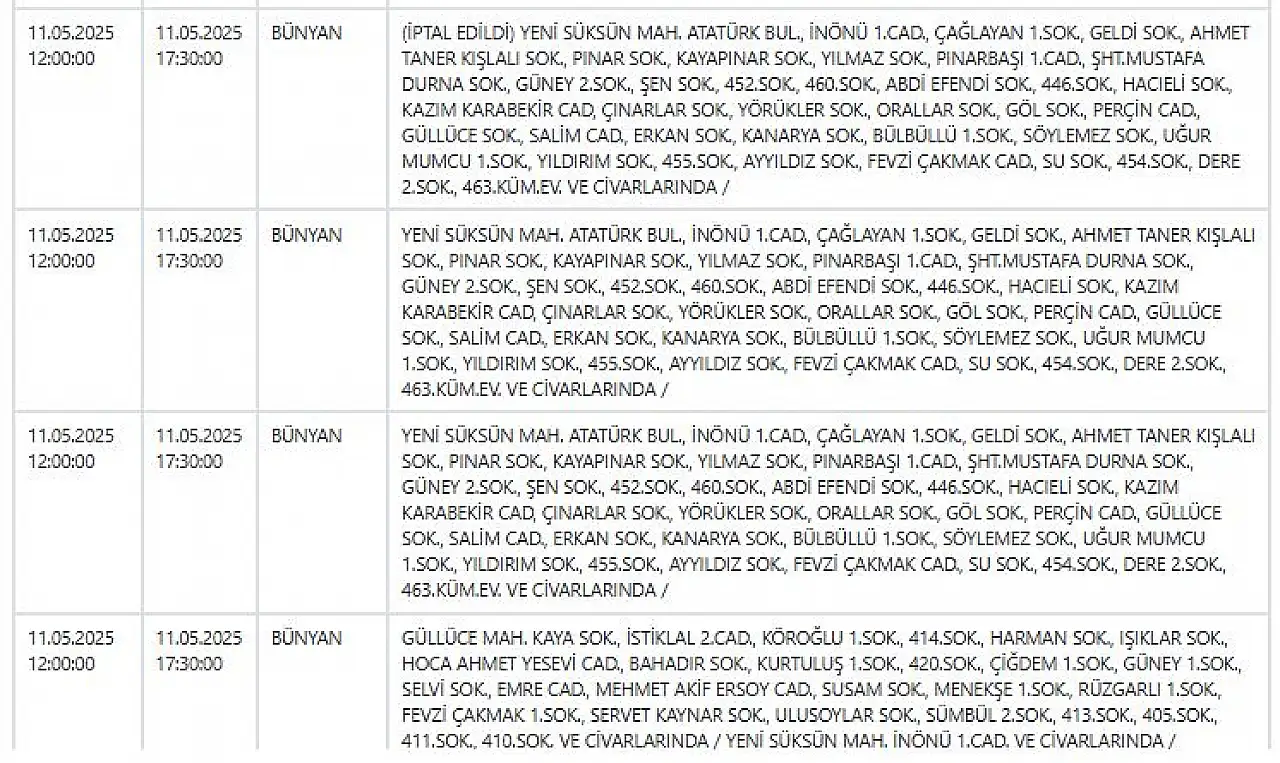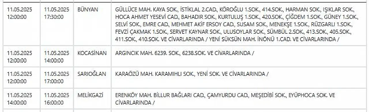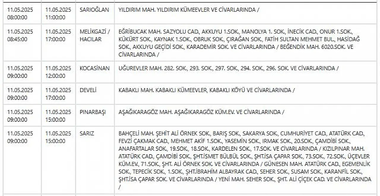 - Kayseri'de hafta sonu elektrik kesintisi: Telefonlarınızı geceden şarj edin! 11 Mayıs 2025