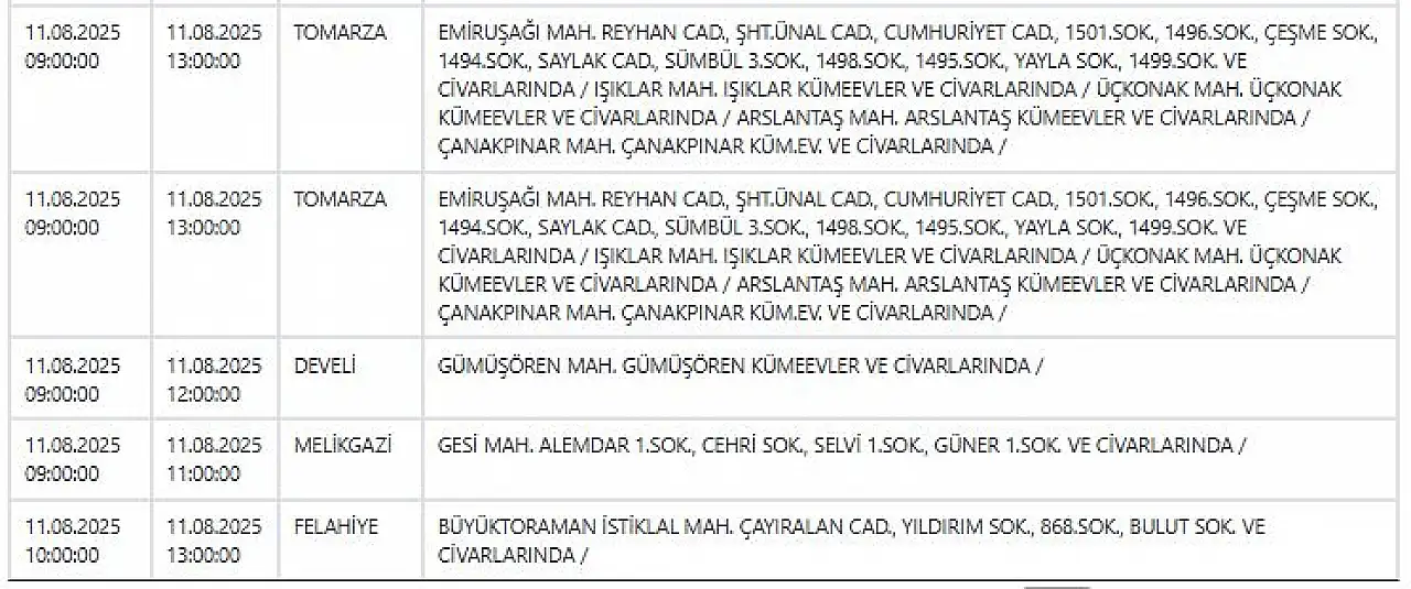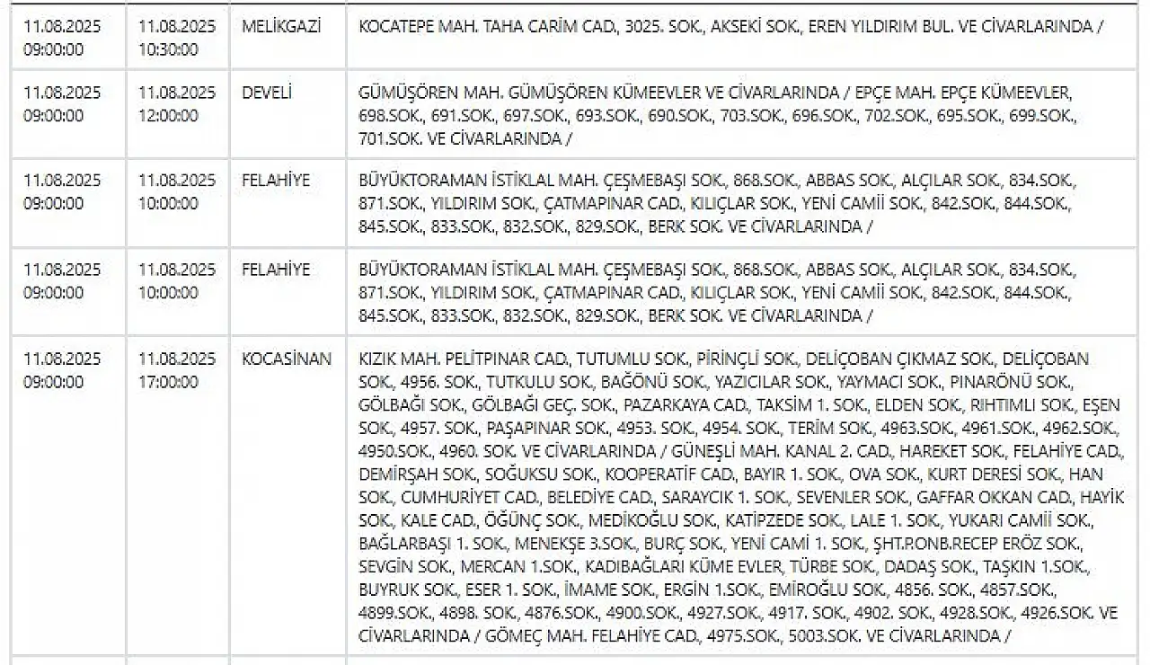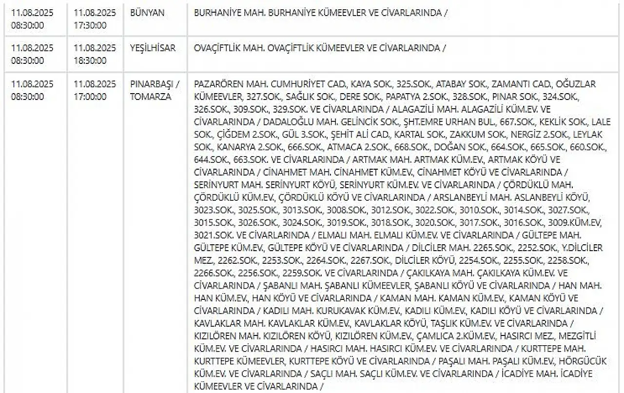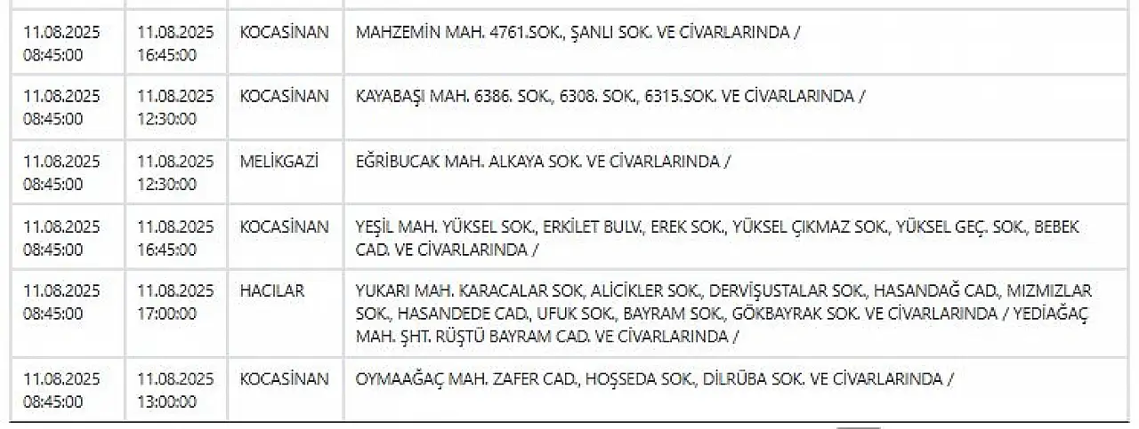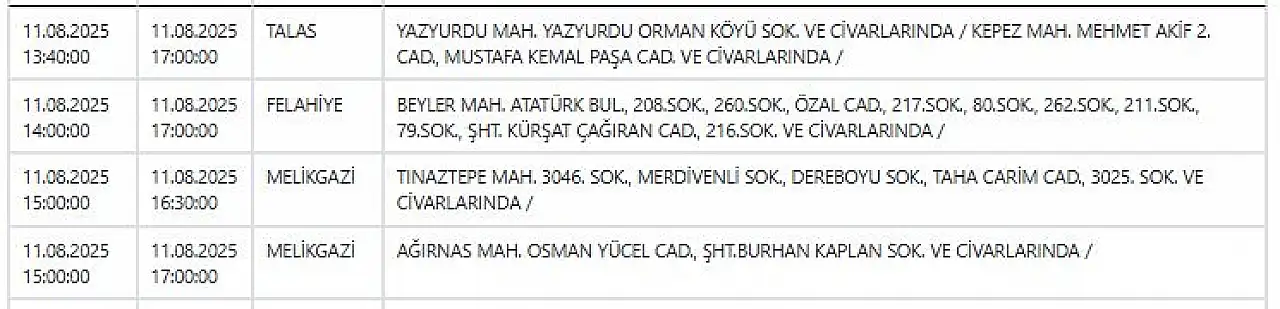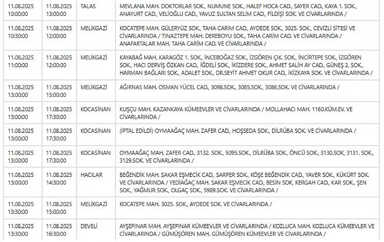 - Kayseri'de haftanın ilk günü elektrik kesintisi uyarısı: Geniş kapsamlı çalışmalar yapılacak! 11 Ağustos 2025