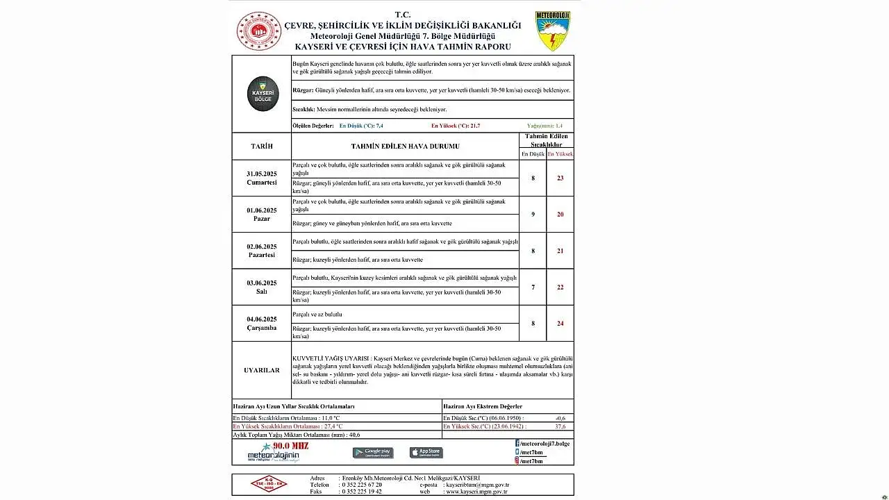 Meteoroloji 7. Bölge Müdürlüğü tarafından yayımlanan tahmin raporuna göre, Kayseri’de 31 Mayıs Cumartesi gününden itibaren sağanak yağışlar etkili olacak. Özellikle öğle saatlerinden sonra yerel olarak kuvvetli sağanak ve gök gürültülü yağışlar bekleniyor.