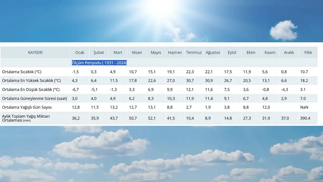 Meteoroloji Genel Müdürlüğü verilerine göre Kayseri’de uzun yıllar ortalamasına göre kasım ayında ortalama sıcaklık 5,6 derece, ortalama en yüksek sıcaklık 13,1 derece, ortalama en düşük sıcaklık ise –0,8 derece olarak ölçülüyor. Kentte bu dönemde ortalama güneşlenme süresi 4,8 saat, yağışlı gün sayısı 12, aylık toplam yağış miktarı ortalaması ise 31,9 mm civarında seyrediyor.