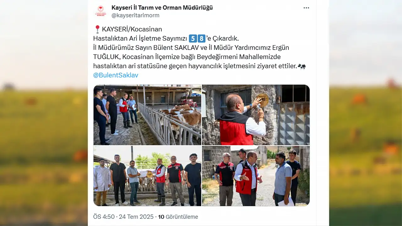 İl Müdürümüz Sayın Bülent SAKLAV ve İl Müdür Yardımcımız Ergün TUĞLUK, Kocasinan İlçemize bağlı Beydeğirmeni Mahallemizde hastalıktan ari statüsüne geçen hayvancılık işletmesini ziyaret ettiler'' ifadelerine yer verildi.