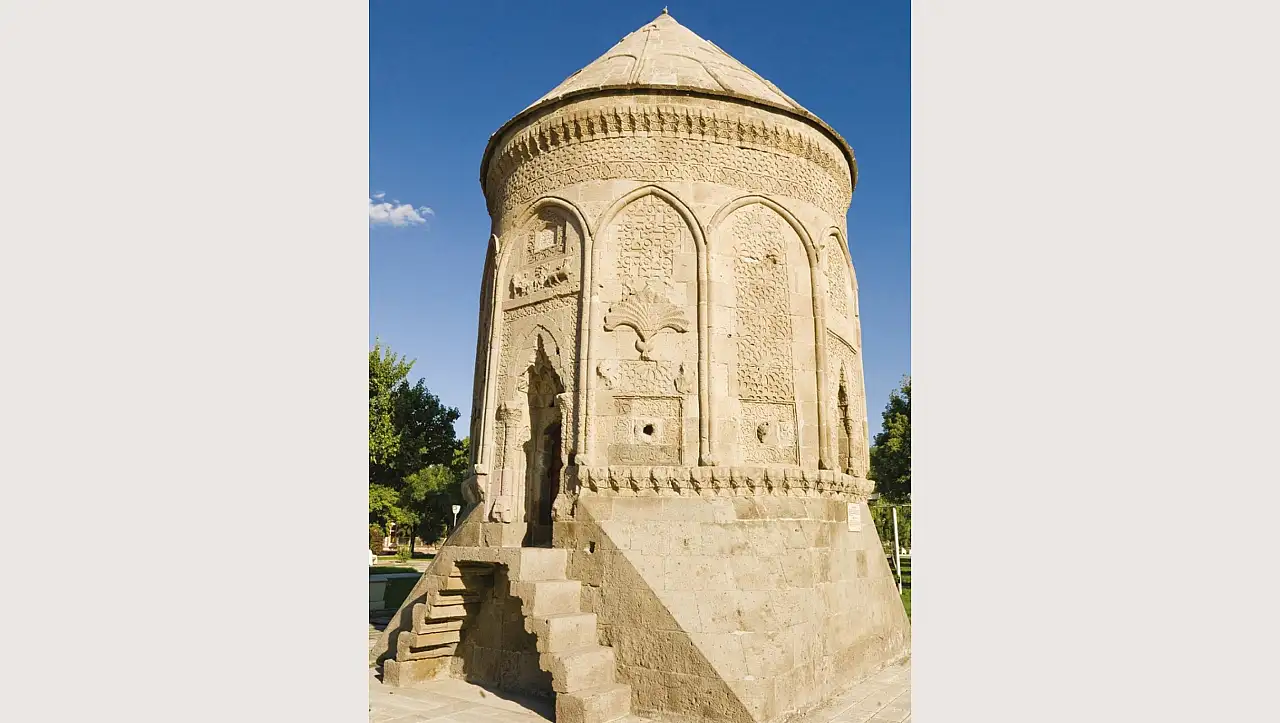 Döner Kümbet, kare bir kaide üzerine oturan on iki köşeli gövdesiyle dikkatleri çekiyor. Dışarıdan konik külah şeklinde görünen Döner Kümbet, içeriden silindirik kubbe ile örtülüdür. Yapının her yüzünde bulunan sivri bir silme taş kemer zeminden kabarık olarak görünür ve köşeler boyunca uzanır. Her köşesinde kabarık motiflerle bezeli olan Döner Kümbet bin yıllık geçmişin ayakta kalmış bir tanığı olarak şehre tarihi bir atmosfer kazandırıyor.