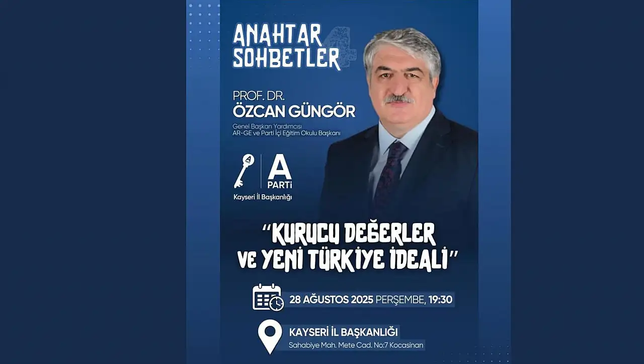 Anahtar Sohbetler programının bu haftaki konuğu Anahtar Parti Genel Başkan Yardımcısı ve AR-GE ve Parti İçi Eğitim Okulu Başkanı Prof. Dr. Özcan Güngör olacak. ‘Kurucu değerler ve yeni Türkiye ideali’ konu başlıklı program 28 Ağustos Perşembe günü saat 19.30’da Anahtar Parti Kayseri İl Başkanlığında yapılacak.