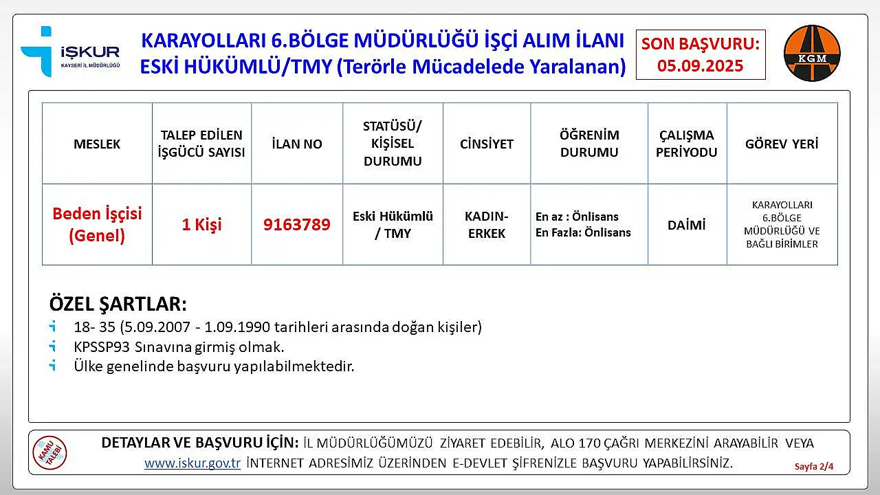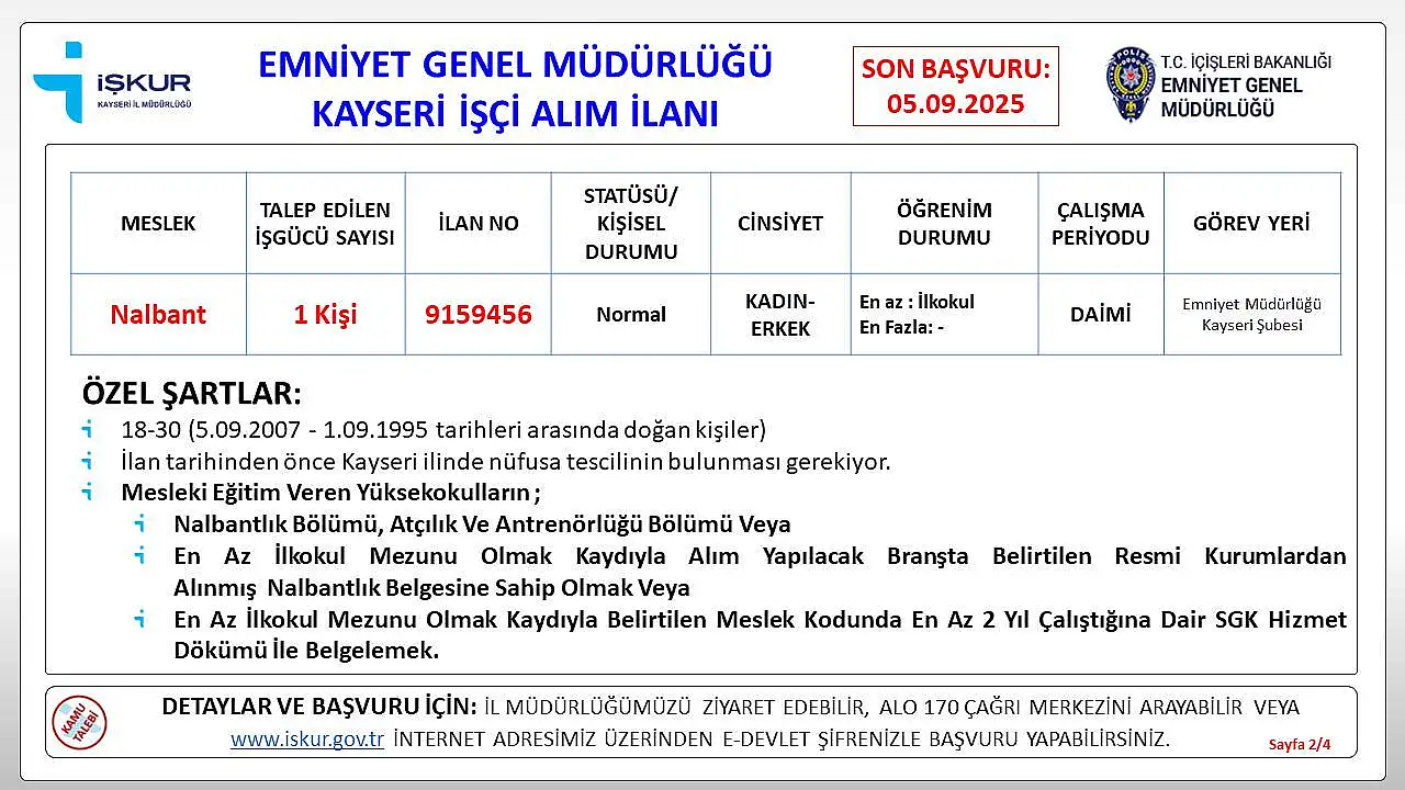 Kayseri İŞKUR İl Müdürlüğü tarafından yapılan paylaşıma göre Karayolları 6. Bölge Müdürlüğü ile Kayseri İl Emniyet Müdürlüğü'ne 1'er adet daimi işçi alınacak.