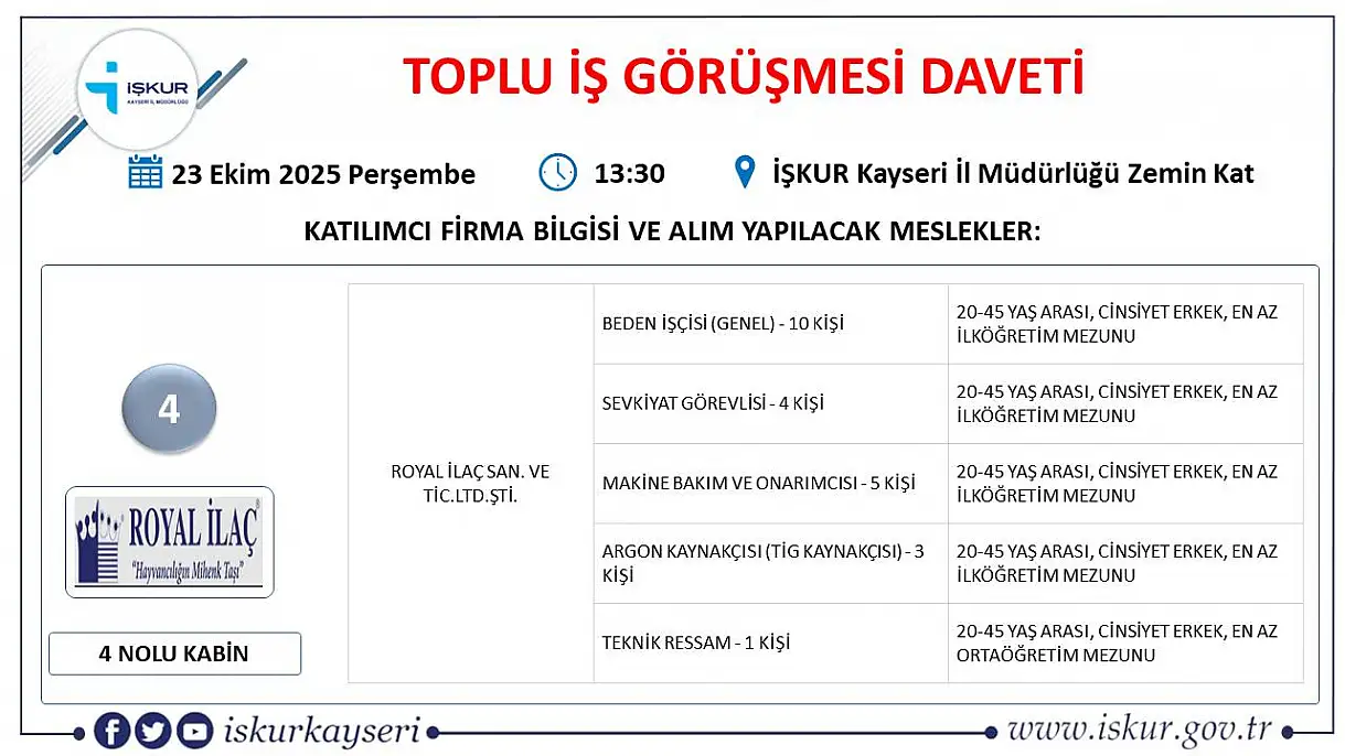 İŞKUR Kayseri İl Müdürlüğü tarafından yapılan duyuruya göre Kayseri'de çok sayıda firma toplu iş görüşmesinde yeni personellerini bulma için bir araya gelecek. Tarih ve detaylar belli oldu. Detaylar Kayseri Anadolu Haber'de...