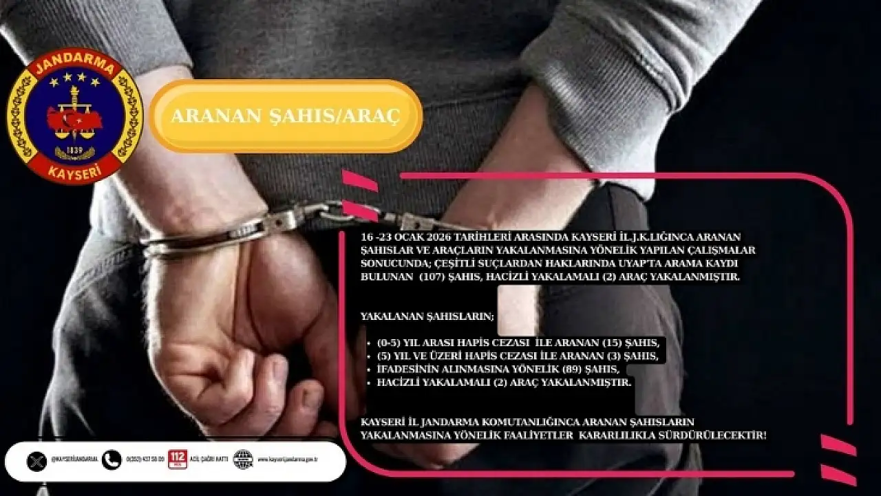 Kayseri'de jandarma ekiplerinin 1 haftalık çalışmasında çeşitli suçlardan aranan 107 kişi yakalandı, hacizli 2 araca el konuldu. Detaylar haberimizde.