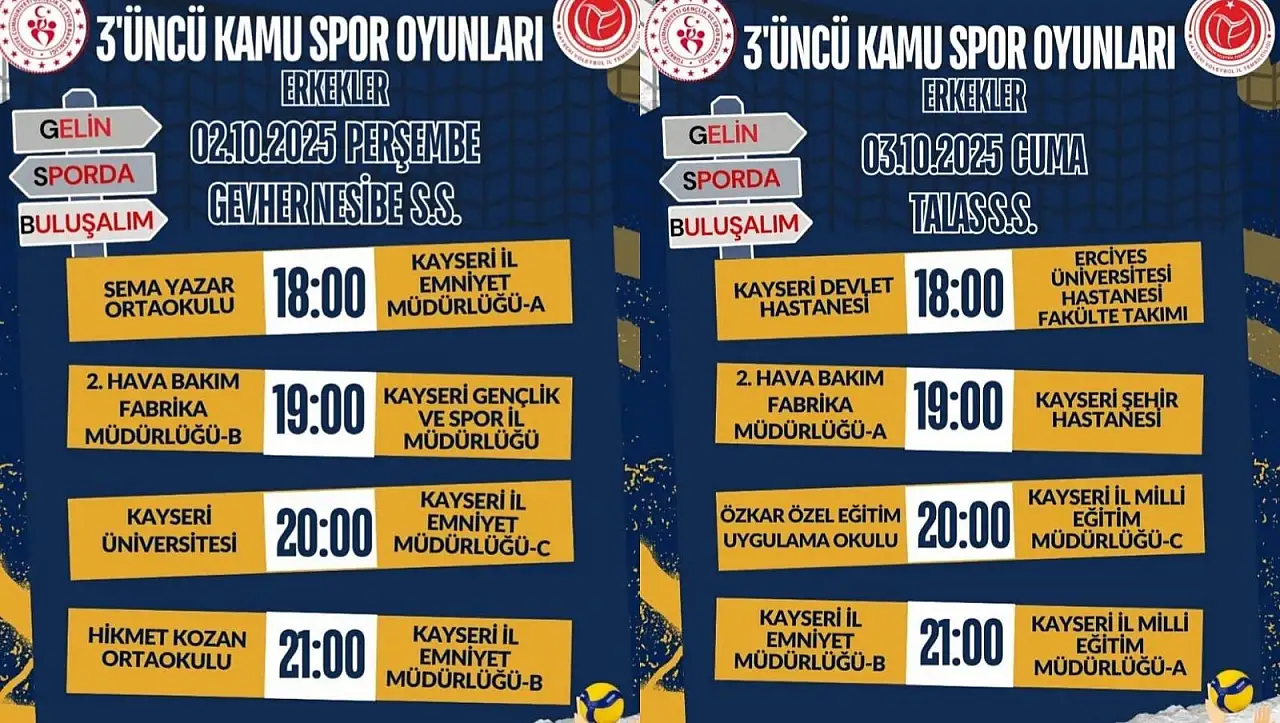 Kamu kurumlarının erkek voleybol takımlarının karşı karşıya geleceği organizasyonda, Kayseri Üniversitesi, Kayseri İl Emniyet Müdürlüğü, Kayseri İl Milli Eğitim Müdürlüğü, Kayseri Devlet Hastanesi, Erciyes Üniversitesi Hastanesi Fakülte Takımı, Şehir Hastanesi, AFAD, 2. Hava Bakım Fabrika Müdürlüğü, Gençlik ve Spor İl Müdürlüğü, Özel Eğitim Uygulama Okulları ve çeşitli ortaokul takımları mücadele edecek. Turnuvada her gün saat 18.00’den itibaren başlayacak karşılaşmalarda kurum takımları kıyasıya rekabet edecek.