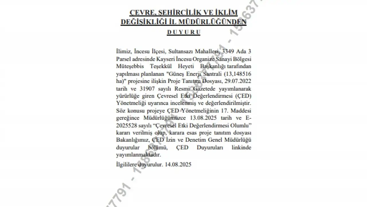 Çevre, Şehircilik ve İklim Değişikliği İl Müdürlüğü Kayseri İncesu Organize Sanayi Bölgesi GES projesine ilişkin duyuru yayımladı. Duyuruda şu ifadelere yer verildi, ‘’İlimiz, İncesu İlçesi, Sultansazı Mahallesi, 3349 Ada 3 Parsel adresinde Kayseri İncesu Organize Sanayi Bölgesi Müteşebbis Teşekkül Heyeti Başkanlığı tarafından yapılması planlanan ‘Güneş Enerji Santrali (13,148516 ha)’ projesine ilişkin Proje Tanıtım Dosyası, 29.07.2022 tarih ve 31907 sayılı Resmi Gazetede yayımlanarak yürürlüğe giren Çevresel Etki Değerlendirmesi (ÇED) Yönetmeliği uyarınca incelenmiş ve değerlendirilmiştir. Söz konusu projeye ÇED Yönetmeliğinin 17. Maddesi gereğince Müdürlüğümüzce 13.08.2025 tarih ve E2025528 sayılı ‘Çevresel Etki Değerlendirmesi Olumlu’ kararı verilmiş olup, karara esas proje tanıtım dosyası Bakanlığımız, ÇED İzin ve Denetim Genel Müdürlüğü duyurular bölümü, ÇED duyuruları linkinde yayımlanmaktadır. İlgililere duyurulur. 14.08.2025''