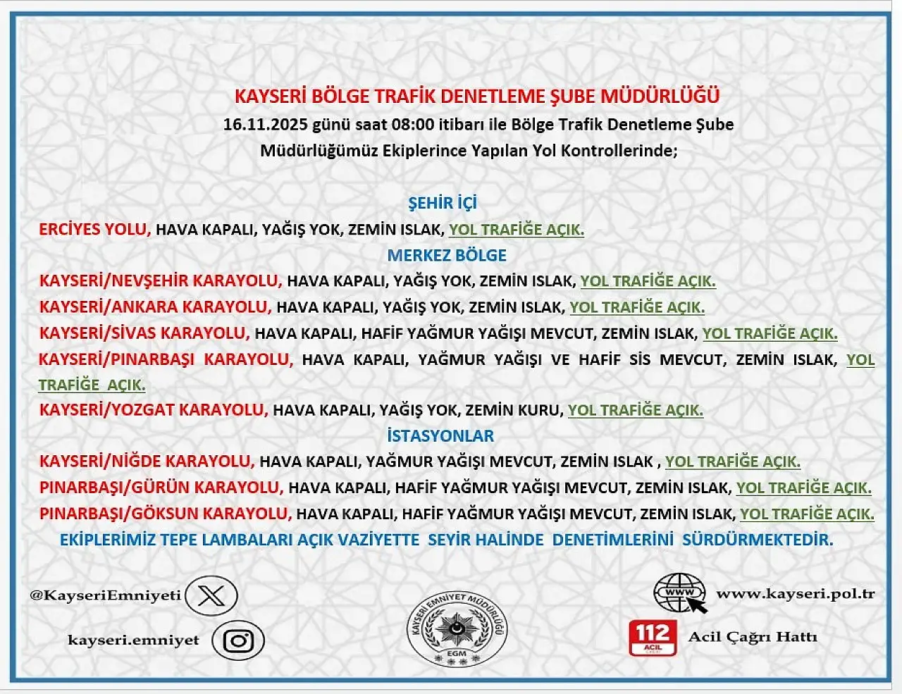 16 Kasım 2025 Pazar günü sabah saat 08:00 itibariyle Erciyes Yolu: Hava kapalı, yağış yok, zemin ıslak, yol trafiğe açık. İlçe yollarında da ulaşımı tehlikeye atabilecek herhangi bir sorun ve yağış olmadığı rapor edildi. Uzmanlar kış lastiği konusunda vatandaşları uyararak kar yağışının etkisini artırması beklendiği önümüzdeki günlerden önce lastiklerin değiştirilmesini tavsiye ediyor.