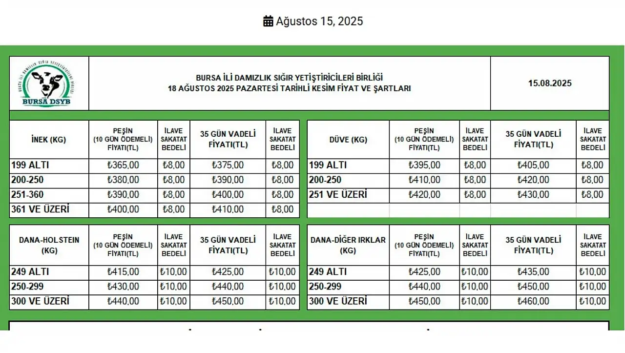 Bursa Damızlık ve Sığır Yetiştiricileri Birliği tarafından 18 Ağustos 2025 pazartesi gününden itibaren geçerli olacak güncel kesim fiyat ve şartlarına ilişkin liste yayımlandı. Buna göre, İnek (KG) - 199 Altı, Peşin (10 gün ödemeli fiyat), 365,00 TL, 36 Gün Vadeli Fiyat, 375,00 TL, 200-250 kg, Peşin, 385,00 TL, Vadeli, 395,00 TL, 251-360, Peşin, 400,00 TL, Vadeli,10,00 TL, 361 ve üzeri Peşin, 420,00 TL İlave, Vadeli, 430,00 TL olarak belirlendi. Kayseri’de ise henüz güncel kesim fiyatları açıklanmadı.