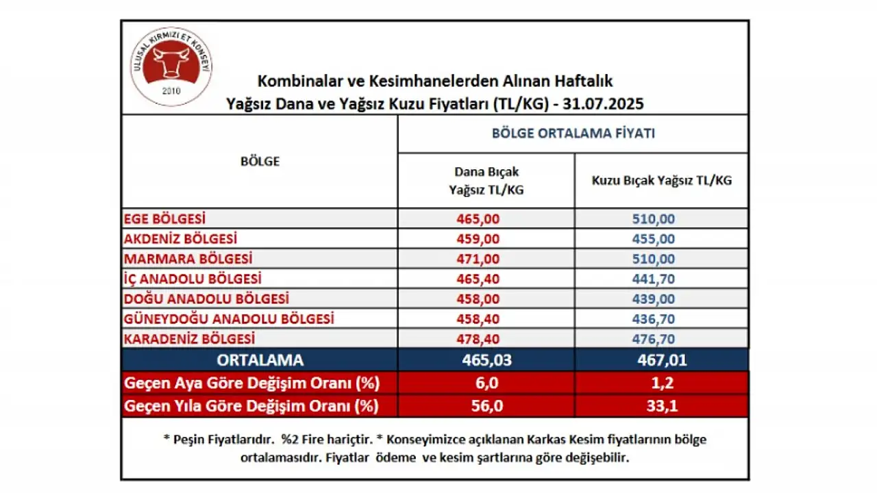 Ulusal Kırmızı Et Konseyi'nin 31 Temmuz 2025 tarihli verilerine göre İç Anadolu Bölgesi'nde: Dana bıçak (yağsız) fiyatı: 465,40 TL/kg, Kuzu bıçak (yağsız) fiyatı: 441,70 TL/kg belirlendi. Türkiye geneline göre İç Anadolu’daki dana eti fiyatı, Türkiye ortalamasının 37 kuruş üzerinde. Yani İç Anadolu, dana fiyatlarında Türkiye ortalamasına en yakın bölgeler arasında yer alıyor. Kuzu eti fiyatı ise Türkiye ortalamasının 25,31 TL altında kalıyor. Bu fark da İç Anadolu’nun kuzu eti fiyatında ülke ortalamasının oldukça gerisinde kaldığını gözler önüne seriyor.