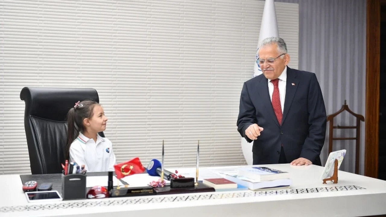 Kayseri Büyükşehir Belediye Başkanı Memduh Büyükkılıç, koltuğunu Azra Günal'a bıraktı. Çocuk başkan Günal, çocuklar için talimatlar verdi.