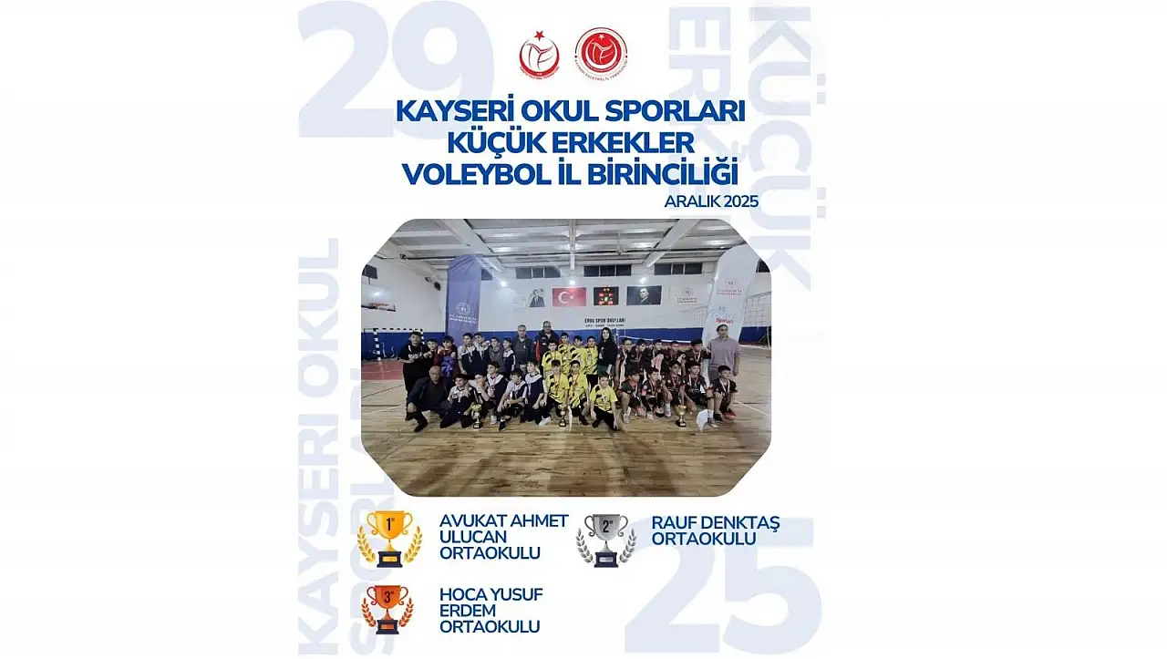Kayseri’de Okul Sporları Küçük Erkekler Voleybol İl Birinciliği müsabakaları düzenlendi. Müsabakalar sonucunda Avukat Ahmet Ulucan Ortaokulu, turnuvayı birinci sırada tamamlayarak il birincisi oldu. Şampiyon takıma kupa ve madalyaları, Avukat Ahmet Ulucan Ortaokulu Beden Eğitimi Öğretmeni Hilal Albayrak tarafından verildi. Turnuvayı ikinci sırada tamamlayan Rauf Denktaş Ortaokulu’nun kupa ve madalyalarını, gözlemci ve KVİT İHGK Sekreteri Cihan Demir verdi. Üçüncülüğü elde eden Hoca Yusuf Erdem Ortaokulu takımına ise kupa ve madalyaları, Hoca Yusuf Erdem Ortaokulu Beden Eğitimi Öğretmeni Nergis Evgin tarafından sunuldu.