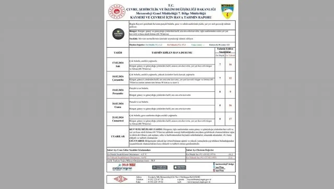 Meteoroloji 7. Bölge Müdürlüğü tarafından yayımlanan hava tahmin raporuna göre, Kayseri'de hafta boyunca yağış ve kuvvetli rüzgar etkili olacak.