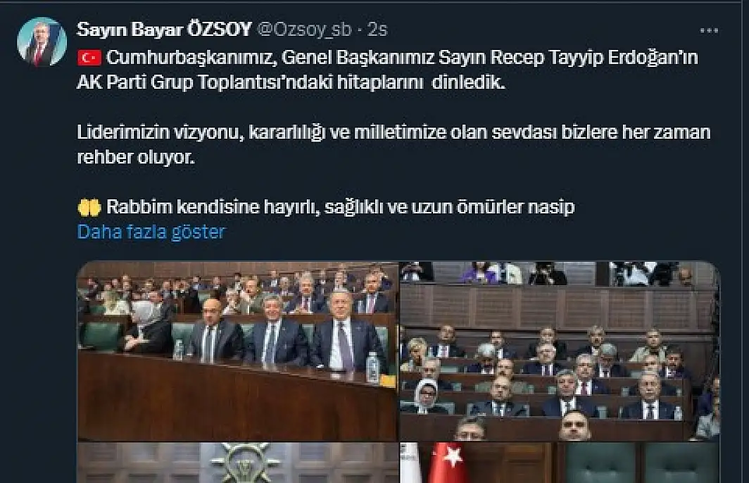 AK Parti Grup Toplantısı’na katıldığını paylaşan Özsoy’un paylaşımında, ‘Cumhurbaşkanımız, Genel Başkanımız Sayın Recep Tayyip Erdoğan’ın AK Parti Grup Toplantısı’ndaki hitaplarını dinledik. Liderimizin vizyonu, kararlılığı ve milletimize olan sevdası bizlere her zaman rehber oluyor.’ İfadeleri yer aldı.