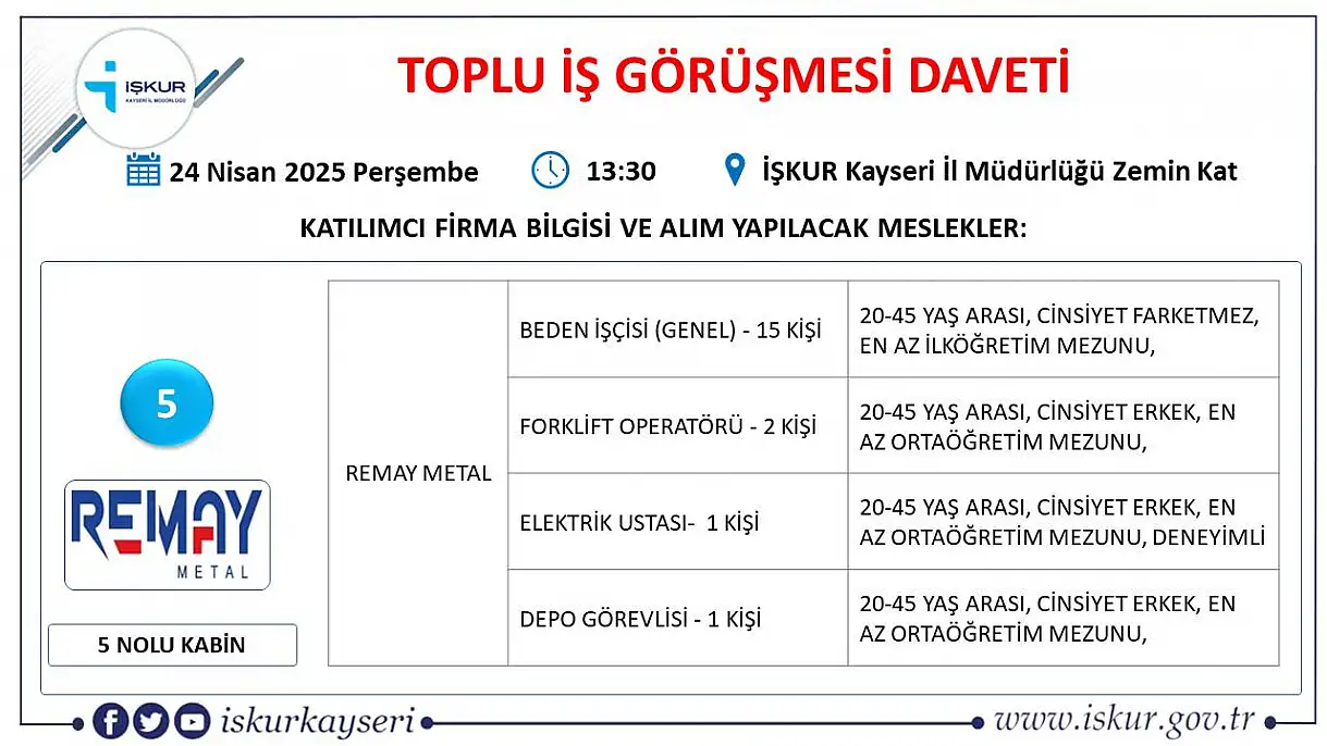 Kayseri'de Nisan ayı İŞKUR toplu iş görüşmesi tarihi belli oldu: 65 farklı meslekten yüzlerce personel alınacak!