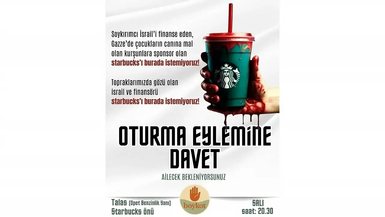 Sosyal medyada Gelecek Bahar isimli bir sayfa tarafından yapılan paylaşımda şu ifadelere yer verildi, ‘Şehrimiz Kayseri’de yeni açılacak olan Starbucks şubesi önünde soykırımı protesto etmeye tüm vicdan sahibi halkımız davetlidir. Soykırımcı İsrail’i finanse eden, Gazze’de çocukların canına mal olan kurşunlara sponsor olan starbucks’ı burada istemiyoruz! Topraklarımızda gözü olan İsrail ve finansörü Starbucks’ı burada istemiyoruz! Oturma eylemine davet. Ailecek bekleniyorsunuz’