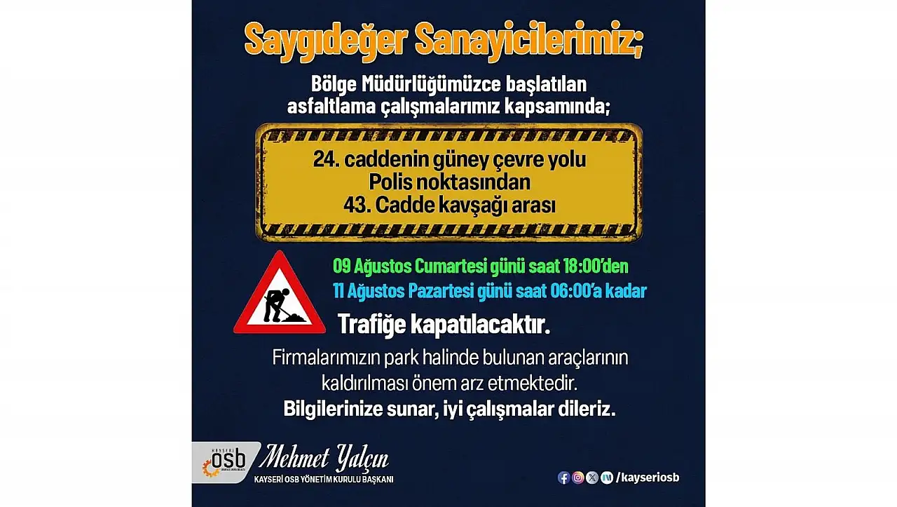 Kayseri Organize Sanayi Bölgesi (OSB) tarafından yapılan açıklamaya göre, 24. caddenin güney çevre yolu Polis noktasından 43. Cadde kavşağı arası asfalt serme işi nedeniyle 2 gün boyunca trafiğe kapatılacak.