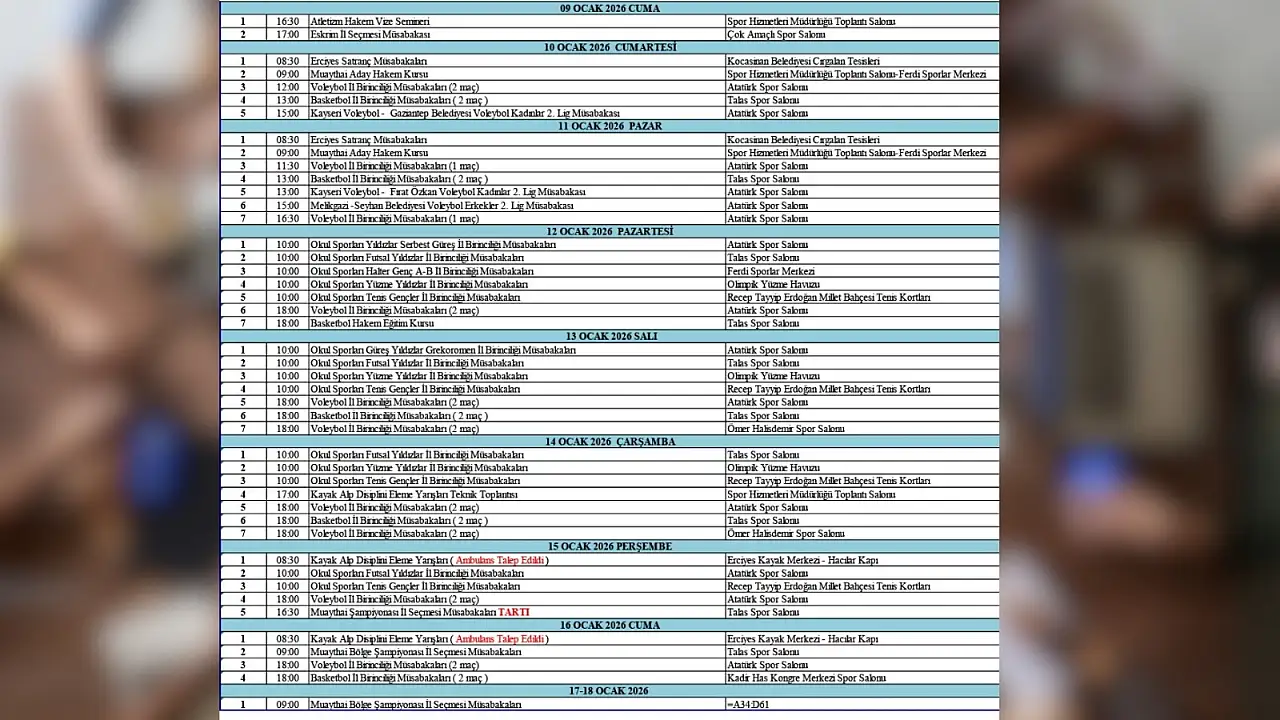 Kayseri Gençlik ve Spor İl Müdürlüğü, 9–18 Ocak 2026 tarihleri arasında kent genelinde düzenlenecek spor organizasyonlarının yer aldığı kapsamlı etkinlik takvimini kamuoyuyla paylaştı. Detaylar Kayseri Anadolu Haber'de…