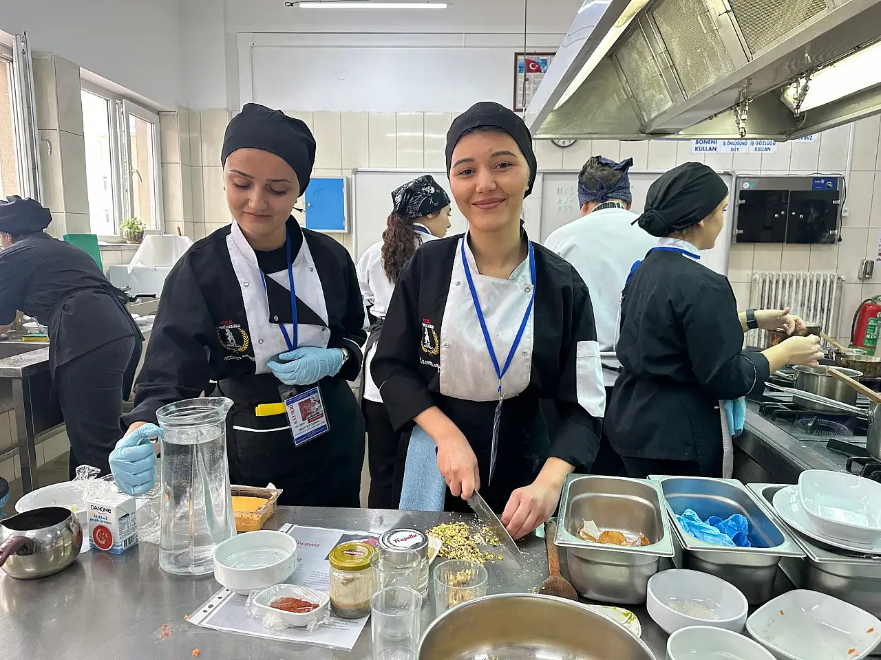 Kocasinan Kız Meslek ve Teknik Anadolu Lisesi Yiyecek İçecek Hizmetleri 11. sınıf öğrencisi Elif Kara ise; ‘Bugün burada başlangıç tabağımız olarak humus yatağında hurmalı pastırma sarması yapıyoruz. Pastırma Kayseri’nin coğrafi işaretli ürünlerinden biri ve o yüzden de pastırma sarmasını seçtik. Ana yemek olarak da pırtım pırt aşı yapacağız. Develi yöresine ait bir yemek o da coğrafi işaretli ürünlerimizden birisi. Tatlı olarak da yine Kayseri’nin coğrafi işaretli ürünü olan nevzine tatlısını seçtik. Bugün bunlarla çok güzel bir tabak çıkarmayı düşünüyoruz. Heyecan da var tabi koşuşturmaca içerisindeyiz arkadaşlarımızla. Yapacağımıza da inanıyoruz. Hedef tabi ki birincilik. Bu umutla geldik biz buraya ve öyle de olacak. Kayseri mutfağına özgü çok ürün çıkaracağız biz buradan. Özellikle de coğrafi işaretli ürünleri seçtik ki daha da çok tanınsın, bilinsin diye’