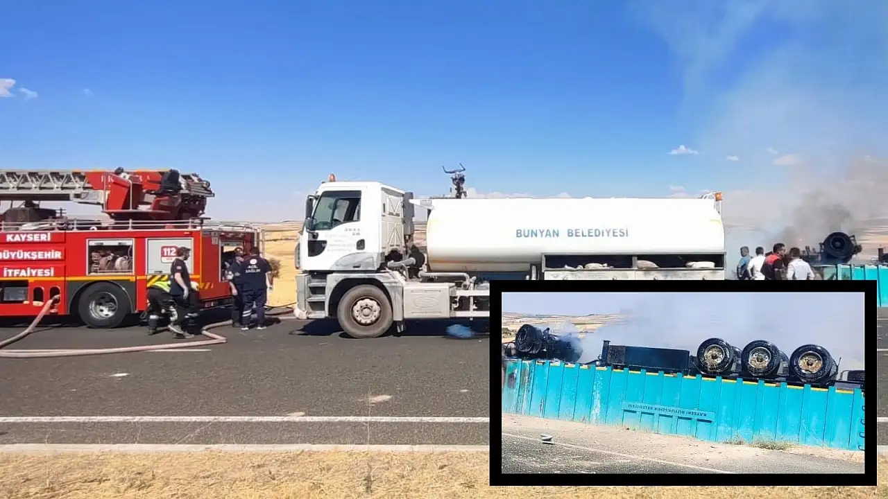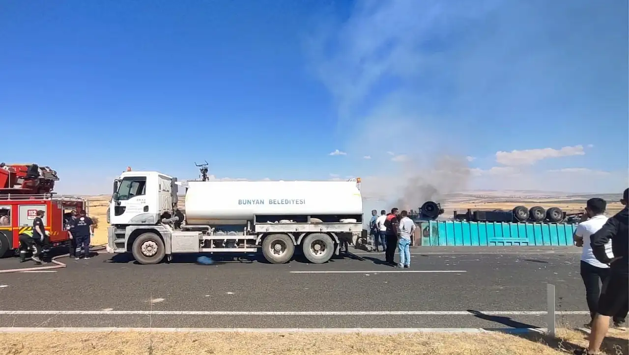 Kayseri’nin Bünyan ilçesinde bir şoför, devrildikten sonra yanan tırdan atlayarak kurtuldu.