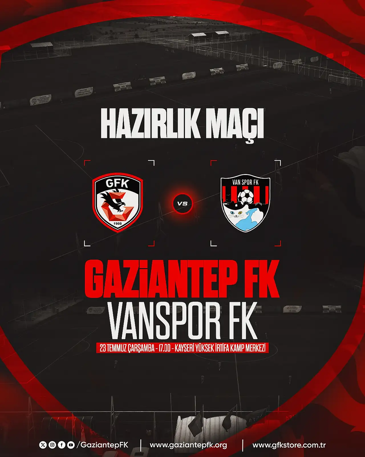 Yeni sezon hazırlıklarını Kayseri'de sürdüren Gaziantep Futbol Kulübü, ikinci hazırlık maçında bugün TFF 1. Lig ekiplerinden Vanspor FK ile karşı karşıya geliyor. Mücadele, Kayseri’de bulunan Yüksek İrtifa Kamp Merkezi'nde oynanacak.