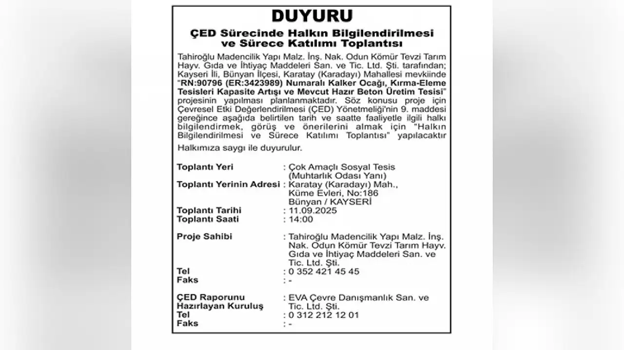 Bünyan’da saat 14.00’te gerçekleşecek toplantı için resmi duyuru yayımladı. İlan.gov.tr’de yer alan duyuruda şu ifadelere yer verildi, ‘’Tahiroğlu Madencilik Yapı Malz. İnş. Nak. Odun Kömür Tevzi Tarım Hayv. Gıda ve İhtiyaç Maddeleri San. ve Tic. Ltd. Şti. tarafından; Kayseri İli, Bünyan İlçesi, Karatay (Karadayı) Mahallesi mevkiinde ‘RN:90796 (ER:3423989) Numaralı Kalker Ocağı, Kırma-Eleme Tesisleri Kapasite Artışı ve Mevcut Hazır Beton Üretim Tesisi’ projesinin yapılması planlanmaktadır. Söz konusu proje için Çevresel Etki Değerlendirilmesi (ÇED) Yönetmeliği'nin 9. maddesi gereğince aşağıda belirtilen tarih ve saatte faaliyetle ilgili halkı bilgilendirmek, görüş ve önerilerini almak için ‘Halkın Bilgilendirilmesi ve Sürece Katılımı Toplantısı’ yapılacaktır. Halkımıza saygı ile duyurulur…’’