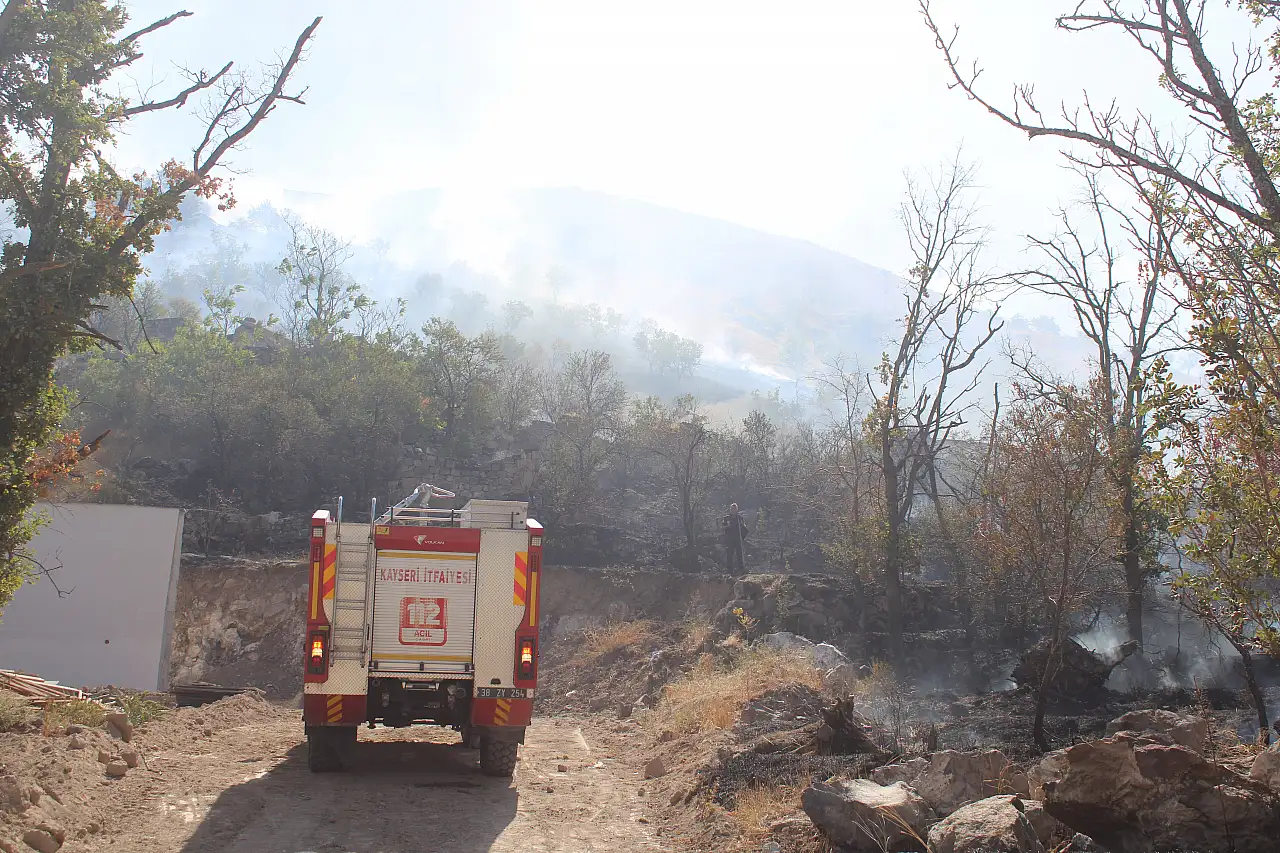 Kayseri’nin Talas ilçesindeki ormanlık alanda çıkan yangına ekiplerin müdahalesi sürüyor. Patlıcan közlenirken dağılan alevler nedeniyle çıktığı belirlenen yangının villalara ulaşmaması için ekipler yoğun çaba sarf ediyor.