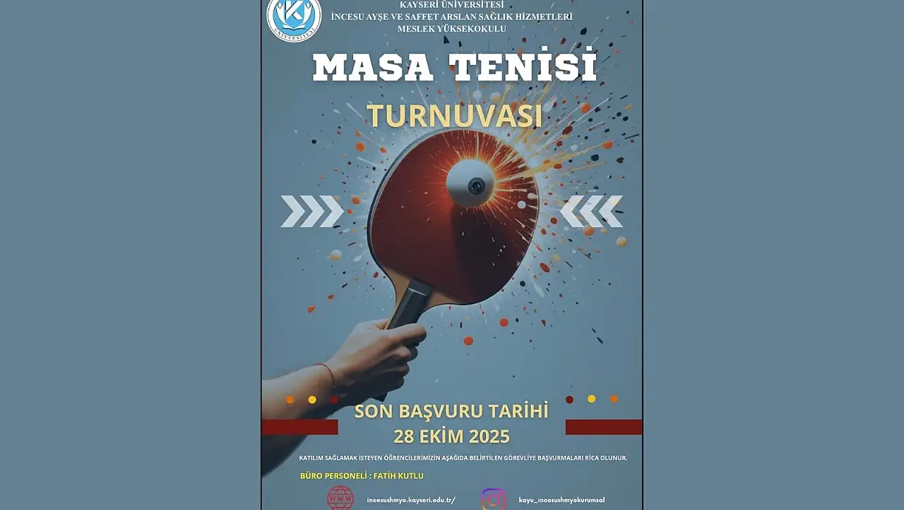 Kayseri Üniversitesi İncesu Ayşe ve Saffet Arslan Sağlık Hizmetleri MYO tarafından düzenlenen Masa Tenisi Turnuvası öğrencilere duyuruldu. Hız, rekabet ve refleksin zirvede olacağı 28 Ekim 2025 tarihine kadar başvuru yapılabilecek.