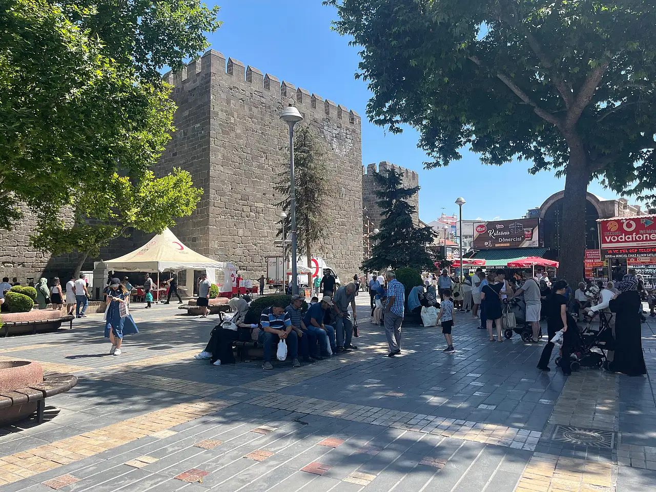 Çarşı meydanları, Kayseri’nin geçmişten günümüze geleneksel ticaret ve sosyal etkileşim alanları olarak biliniyor. Vatandaşlar, bu meydanları sadece alışveriş için değil, vakit geçirmek amacıyla da olarak da kullanıyor. Gölge yerlerin kalmadığı meydanın göbeğinde sıcaklıkla başa çıkamayan vatandaşlar surların dibindeki banklara oturuyor. Sıcak ve güneşin düştüğü yerler boş kalıyor.