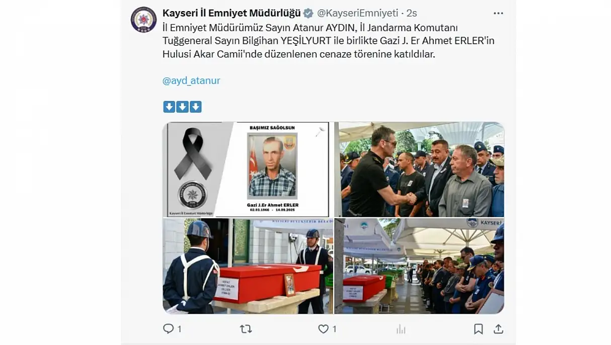 Kayseri İl Emniyet Müdürü Atanur Aydın İl Jandarma Komutanı Tuğgeneral Sayın Bilgihan Yeşilyurt ile birlikte Gazi J. Er Ahmet Erler’in cenaze törenine katıldı.