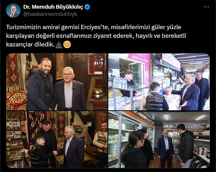 Kayseri Büyükşehir Belediye Başkanı Memduh Büyükkılıç, esnaflarla bir araya gelerek, sıcak ve samimi sohbetler gerçekleştirdi. Büyükkılıç, esnaf ziyaretlerini sosyal medya hesabından paylaştı.