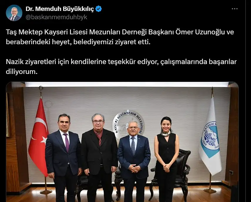 Kayseri Büyükşehir Belediye Başkanı Dr. Memduh Büyükkılıç, Taş Mektep Kayseri Lisesi Mezunları Derneği Başkanı Ömer Uzunoğlu ve beraberindeki heyeti belediyede ağırladı.