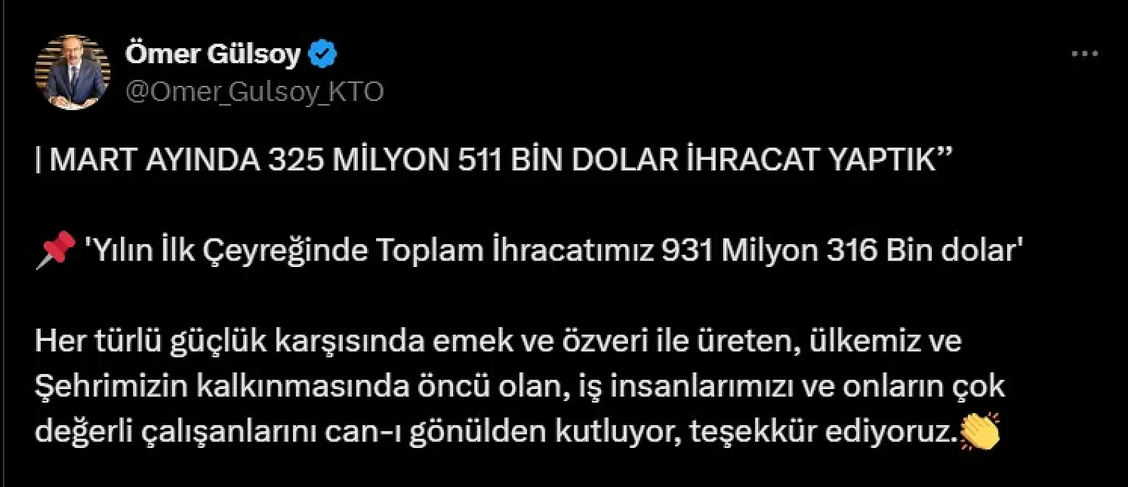 Kayseri Ticaret Odası Başkanı Ömer Gülsoy, Mart ayında yapılan ihracatın 325 milyon 511 bin dolar olduğu ile ilgili bir paylaşım yaptı. Yılın ilk çeyreğinde ise toplam ihracat 931 milyon 316 bin dolara ulaşarak büyük bir başarıya imza atıldı. Başkan Gülsoy, sosyal medya hesabından yaptığı paylaşımda, her türlü zorluk karşısında ülke ve şehir kalkınmasına katkı sağlayan iş insanları ve çalışanlarını kutladı. ‘Emek ve özveriyle üreten iş insanlarımız, şehrimizin ve ülkemizin kalkınmasında öncü rol oynuyor. Kendilerine canı gönülden teşekkür ediyoruz’ ifadelerine yer verdi.