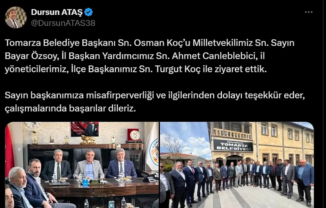 AK Parti Kayseri Milletvekili Dursun Ataş, sosyal medya üzerinden yaptığı paylaşımla, Tomarza Belediye Başkanı Osman Koç’u ziyaret ettiklerini duyurdu. Ataş’ın paylaşımında, ziyaretin AK Parti Kayseri Milletvekili Bayar Özsoy, İl Başkan Yardımcısı Ahmet Canleblebici, il yöneticileri ve İlçe Başkanı Turgut Koç ile birlikte gerçekleştirildiği belirtildi.