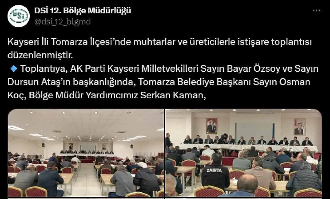Kayseri'nin Tomarza ilçesinde, muhtarlar ve üreticilerle bir istişare toplantısı düzenlendi. Toplantıya, AK Parti Kayseri Milletvekilleri Bayar Özsoy ve Dursun Ataş'ın başkanlığında, Tomarza Belediye Başkanı Osman Koç ve DSİ 12. Bölge Müdürlüğü Bölge Müdür Yardımcısı Serkan Kaman da katıldı.