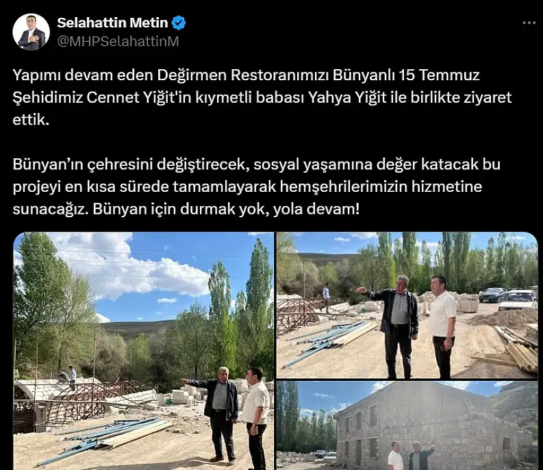 Bünyan Belediye Başkanı Selahattin Metin, yapımı devam eden Değirmen Restoran projesini 15 Temmuz şehidi Cennet Yiğit’in babası Yahya Yiğit ile birlikte ziyaret etti. Ziyarete ilişkin açıklamayı sosyal medya hesabından yapan Başkan Metin, projenin Bünyan’ın sosyal hayatına büyük katkı sağlayacağını belirtti.
