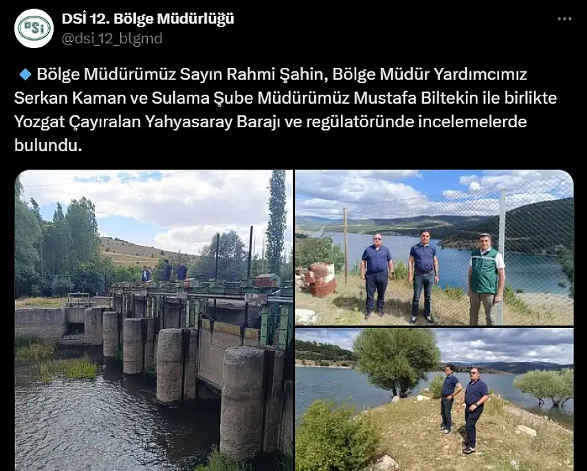 Devlet Su İşleri (DSİ) 12. Bölge Müdürlüğü, sosyal medya hesabından yaptığı paylaşımda, Bölge Müdürü Rahmi Şahin’in, Bölge Müdür Yardımcısı Serkan Kaman ve Sulama Şube Müdürü Mustafa Biltekin ile birlikte Yozgat Çayıralan Yahyasaray Barajı ve regülatöründe incelemelerde bulunduğunu duyurdu. Bölge Müdürlüğü yetkilileri, sahada yapılan çalışmaları yakından takip ederek, projelerin ilerleyişi hakkında değerlendirmelerde bulundu.