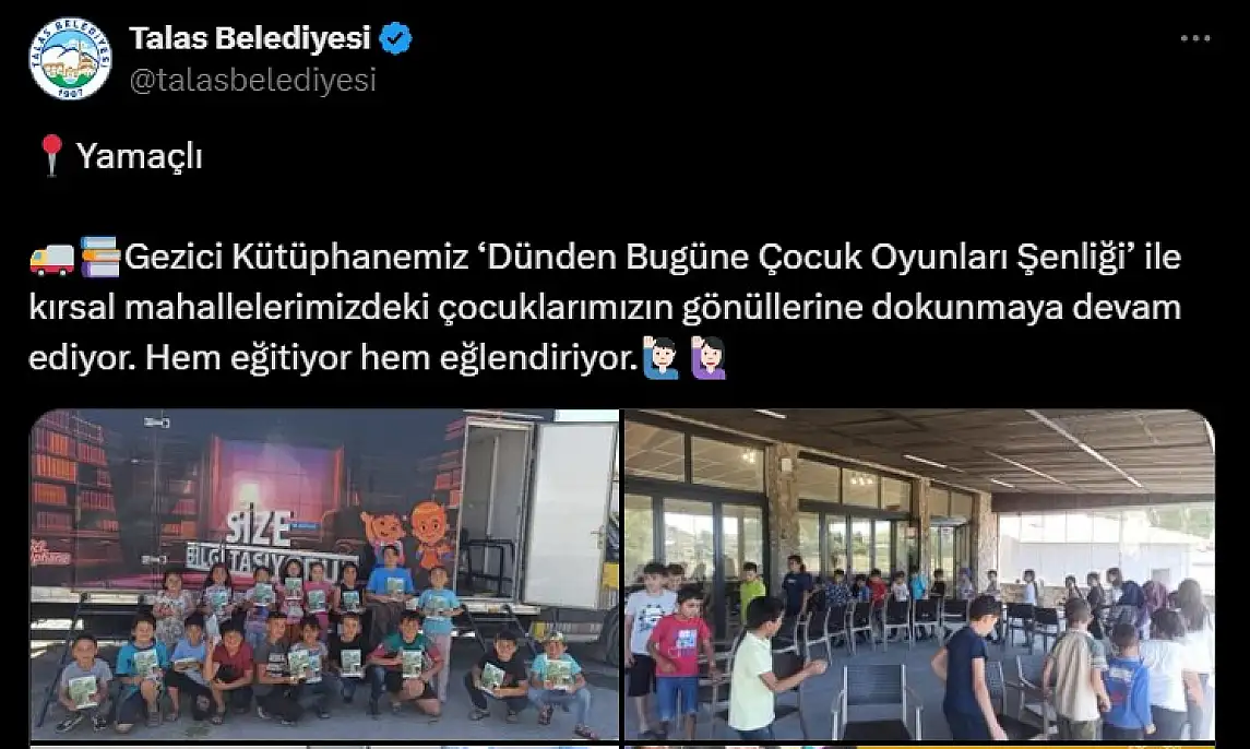 Talas Belediyesi, resmi sosyal medya hesabından yaptığı paylaşımda, Gezici Kütüphanesi’nin ‘Dünden Bugüne Çocuk Oyunları Şenliği’ ile kırsal mahallelerdeki çocukların gönüllerine dokunmaya devam ettiğini duyurdu. Paylaşımda, etkinliğin çocukları hem eğittiği hem de eğlendirdiği belirtildi. Talas Belediyesi, bu tür projelerle kırsal kesimdeki çocukların gelişimine katkı sağlamaya devam ediyor.