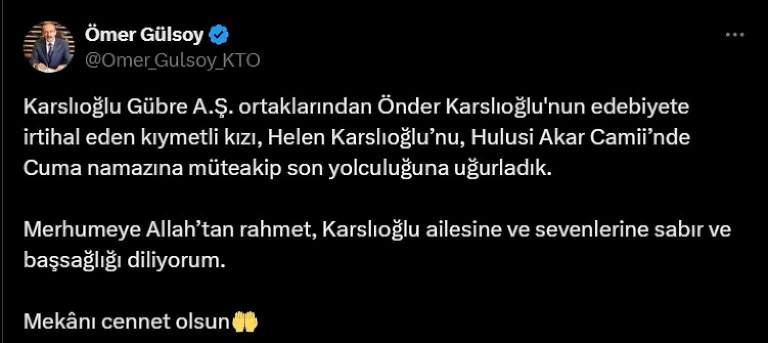 Karslıoğlu Gübre A.Ş. ortaklarından Önder Karslıoğlu’nun kızı Helen Karslıoğlu, Hulusi Akar Camii’nde Cuma namazına müteakip kılınan cenaze namazının ardından son yolculuğuna uğurlandı. Törene, Karslıoğlu ailesinin yakınlarının yanı sıra çok sayıda vatandaş da katıldı. Kayseri Ticaret Odası Başkanı Ömer Gülsoy; ‘Merhumeye Allah’tan rahmet, ailesine ve sevenlerine başsağlığı diliyorum. Mekânı cennet olsun’ ifadelerini kullandı.