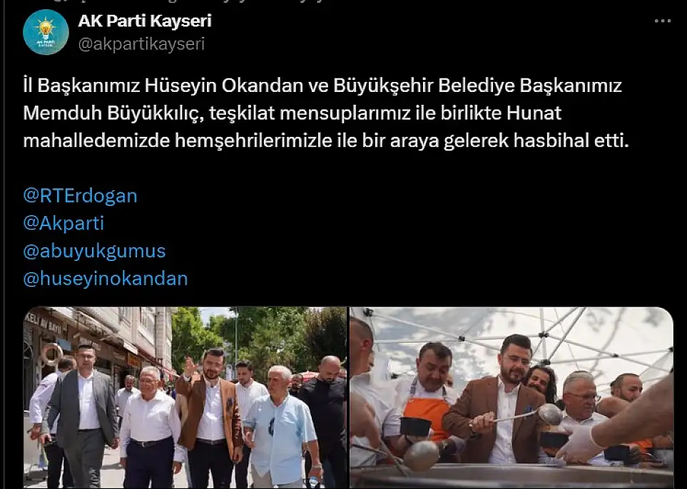 AK Parti Kayseri İl Başkanı Hüseyin Okandan ve Kayseri Büyükşehir Belediye Başkanı Memduh Büyükkılıç, teşkilat mensupları ile birlikte Hunat Mahallesi’nde vatandaşlarla buluştu. Ziyarette, mahalle sakinlerinin talepleri dinlenirken, güncel yerel konular üzerine sohbet edildi. Partililer, vatandaşlarla birebir temas kurarak mahalledeki çalışmalara ilişkin bilgilendirmelerde bulundu.